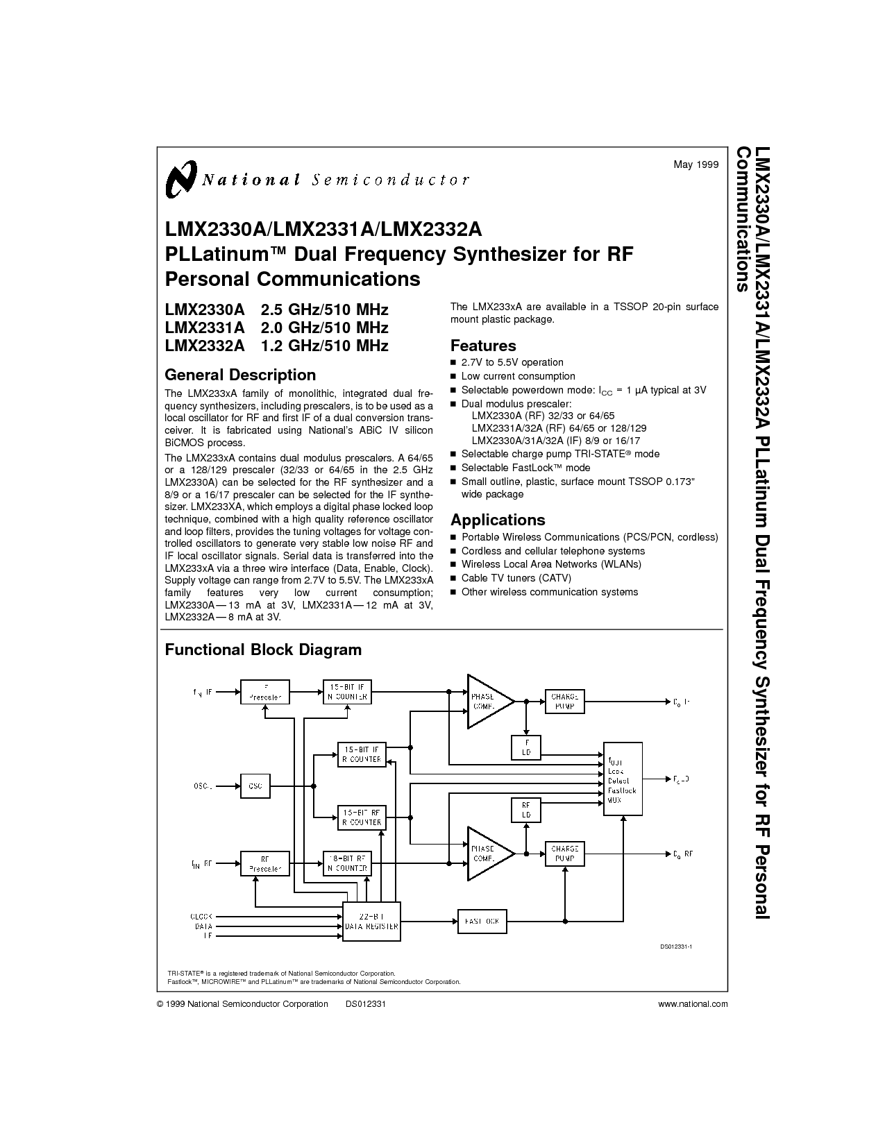 lmx2330a/lmx2331a/lmx2332a PLLatinum 双 频率 合成器 用于 RF 个人