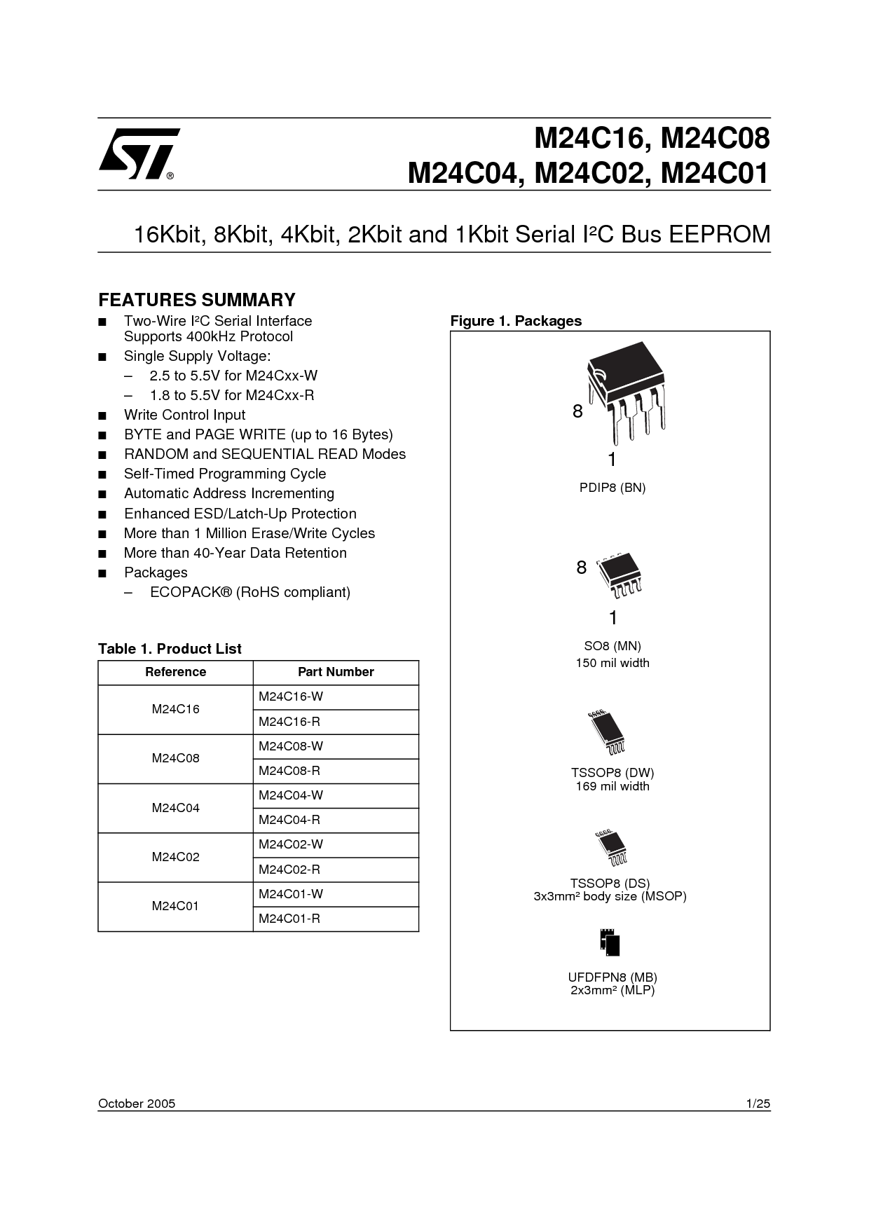 16Kbit, 8Kbit, 4Kbit, 2Kbit and 1Kbit Serial I2C Bus EEPROM