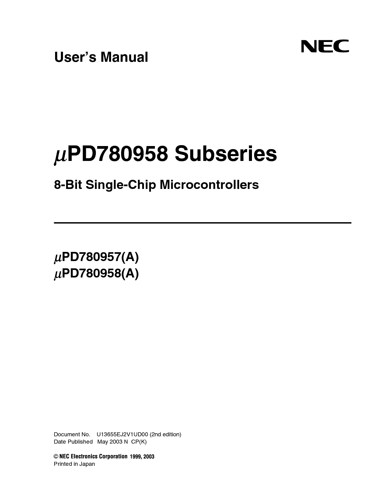 用户’s 手册 µ µµ µ pd780957(一个) µ µµ µ pd780958(一个) µ µµ µ pd780958 subseries 8-有点 单芯片 微控制器 已打印 入点 日本 文件 否. u13655ej2v1ud00 (2nd 版本) 日期 已发布 将 2003 n cp(k) c | |