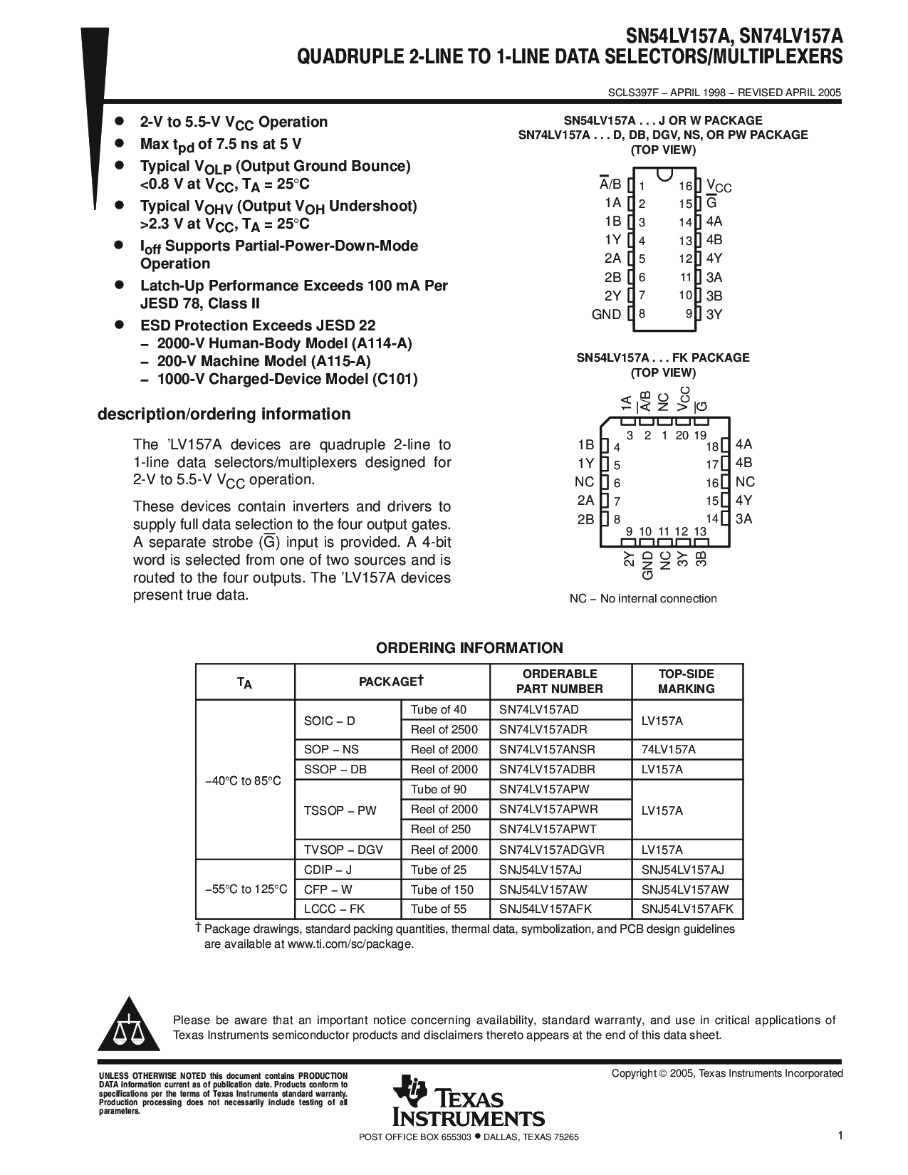 SN74LV157A ...d, db, dgv,ns, 或 pw 包装