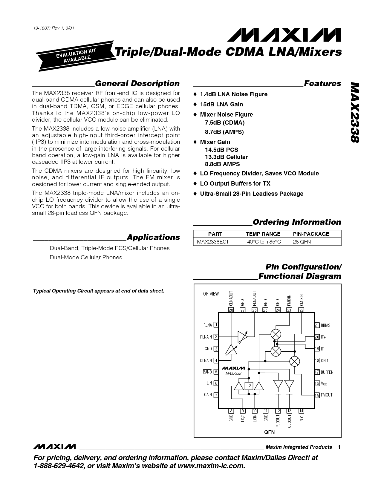 这 max2338 三倍-模式 lna/搅拌机 包括 一个 开启-