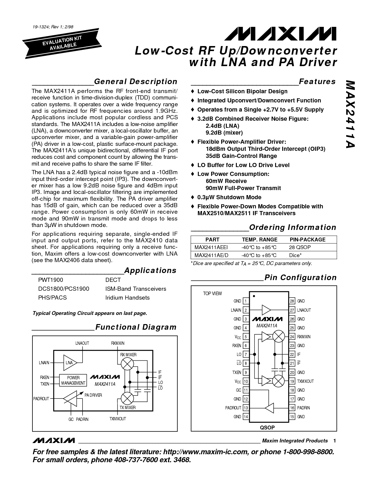 标准. 这 max2411a 包括 一个 低噪声 放大器