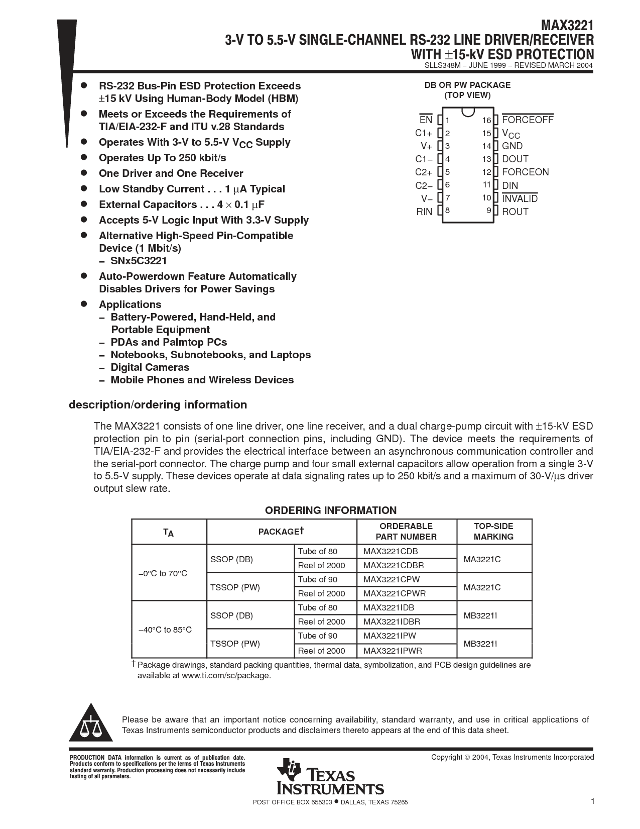这 max3221 由 的 一个 线 驾驶员, 一个 线 接收器, 和 一个 双 电荷泵 电路 与