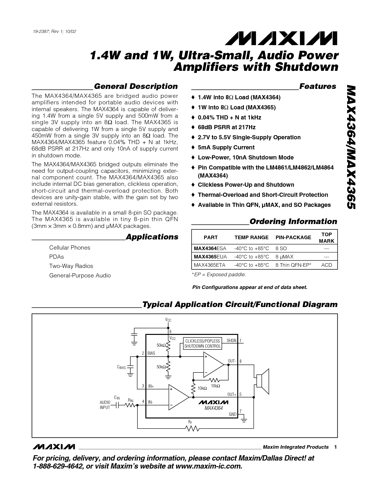 1.4W and 1W, Ultra-Small, Audio Power Amplifiers with Shutdown