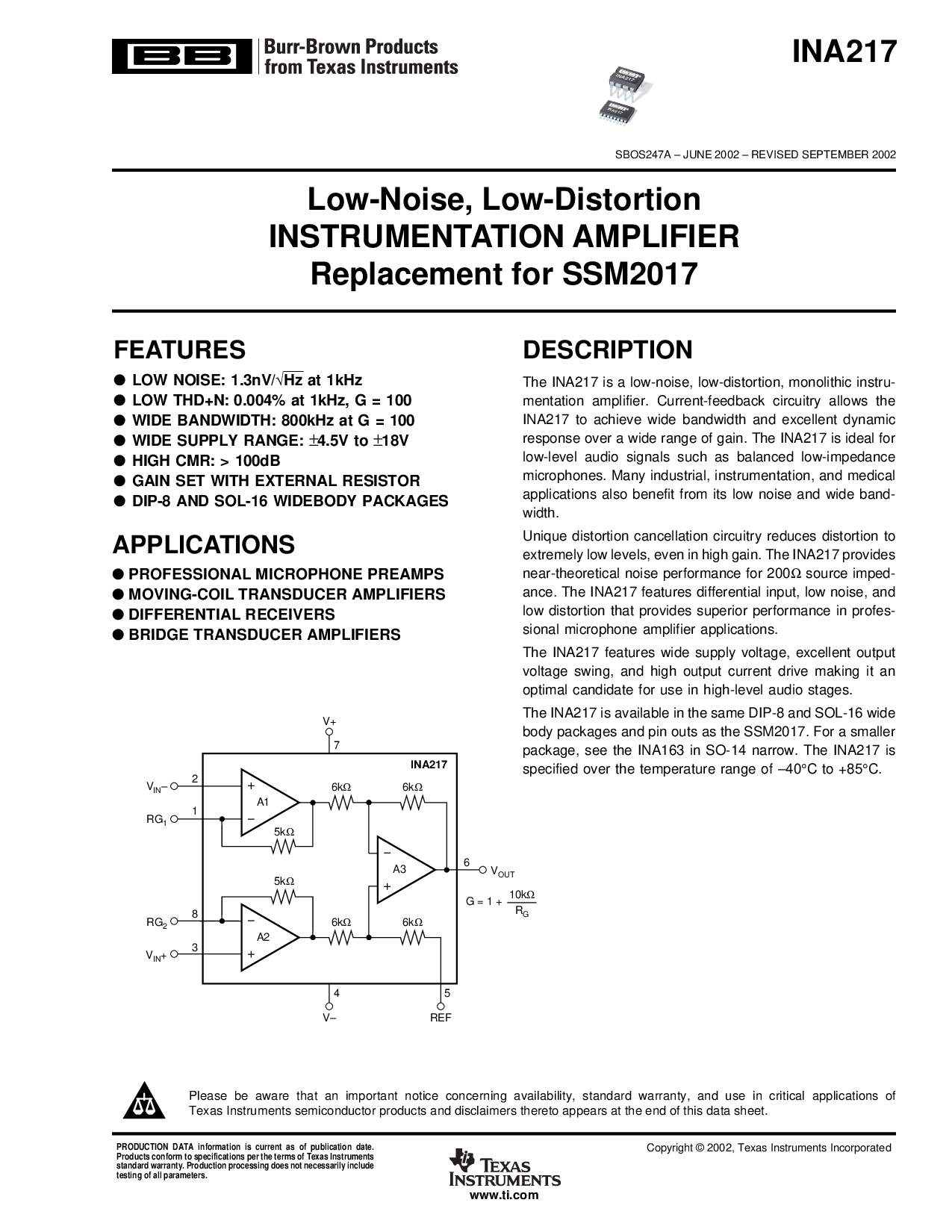标准. 这 ina217 特点 差速器 输入, 低 噪声, 和