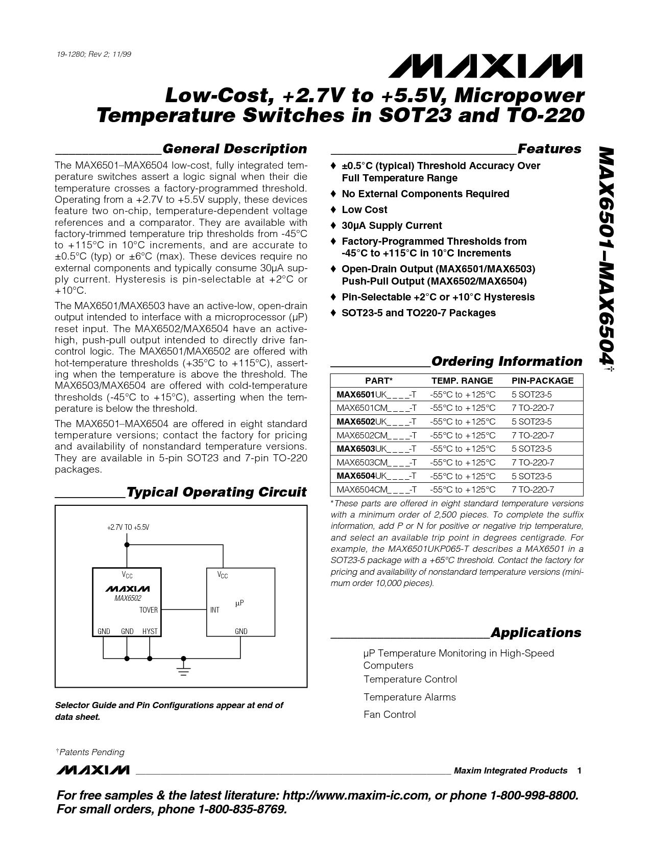 Low-Cost, +2.7V to +5.5V, Micropower Temperature Switches in SOT23 and TO-220