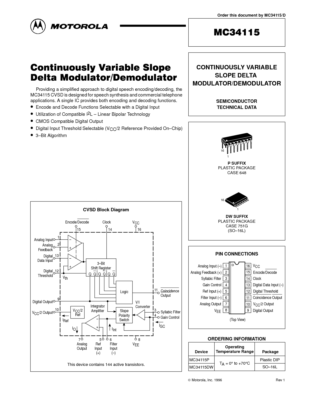 MC34115cvsd 是 设计 用于 演讲 合成 和 商业 电话