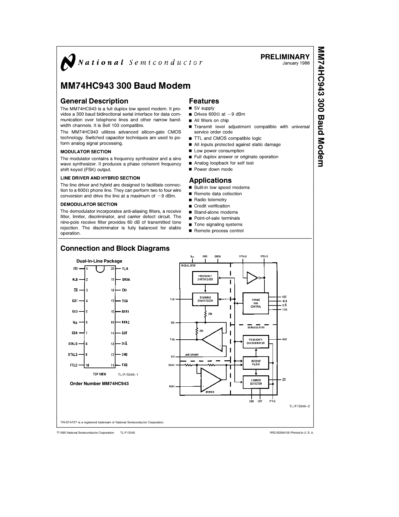 MM74HC943 300 波特 调制解调器