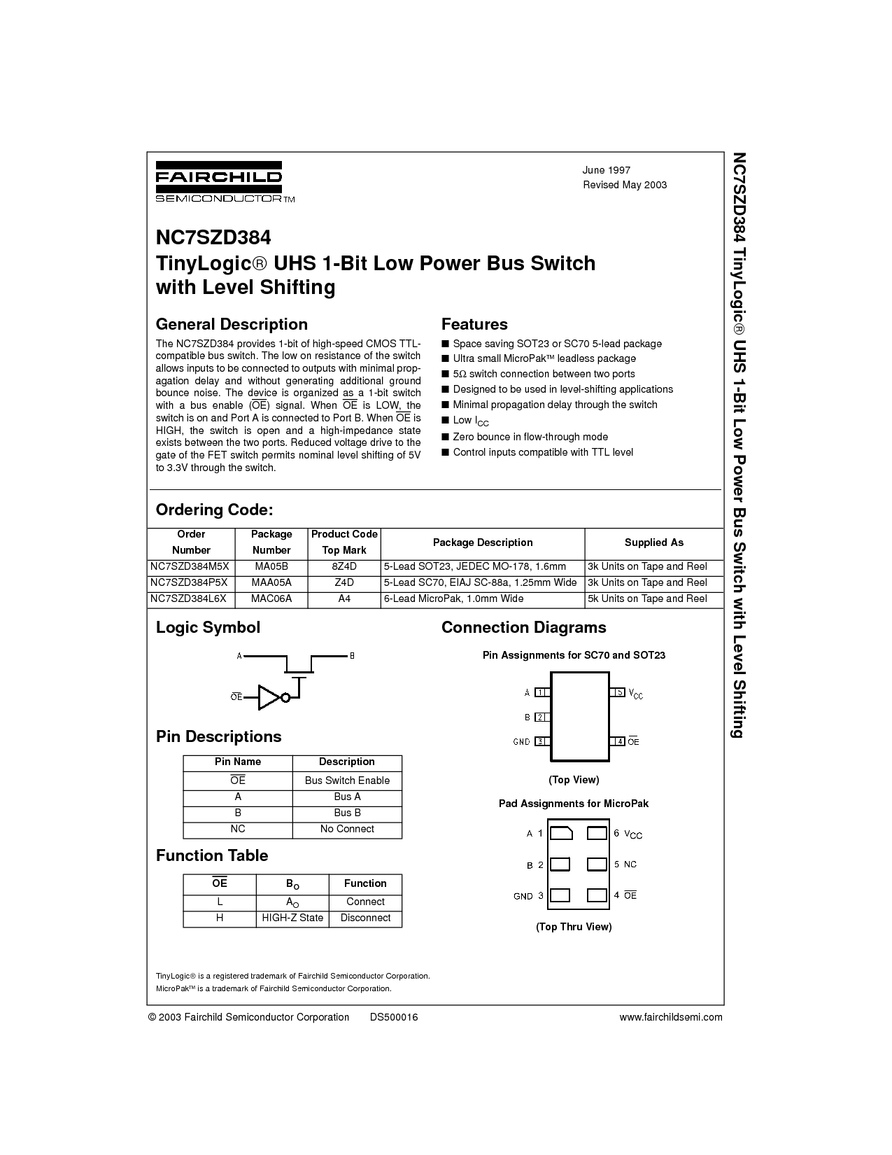 NC7SZD384L6X MAC06A A4 6-铅 micropak, 1.0mm 宽 5k 单位 开启 胶带 和 卷轴