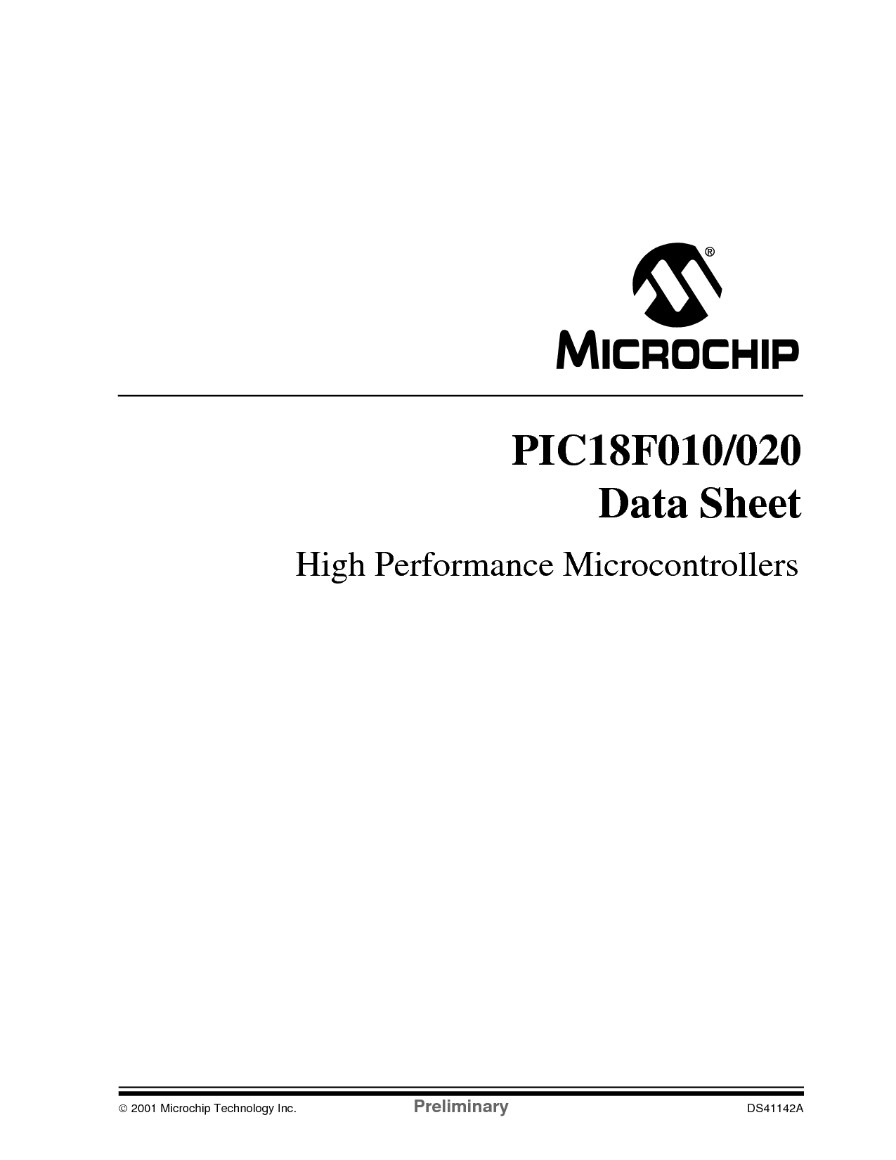 2001 微芯片 技术 公司 初步 DS41142A pic18f010/020 数据 工作表 高 业绩 微控制器 | |