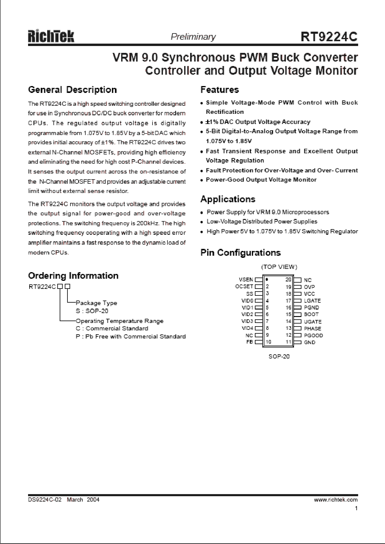 VRM 9.0 Synchronous PWM Buck Converter Controller and Output Voltage Monitor