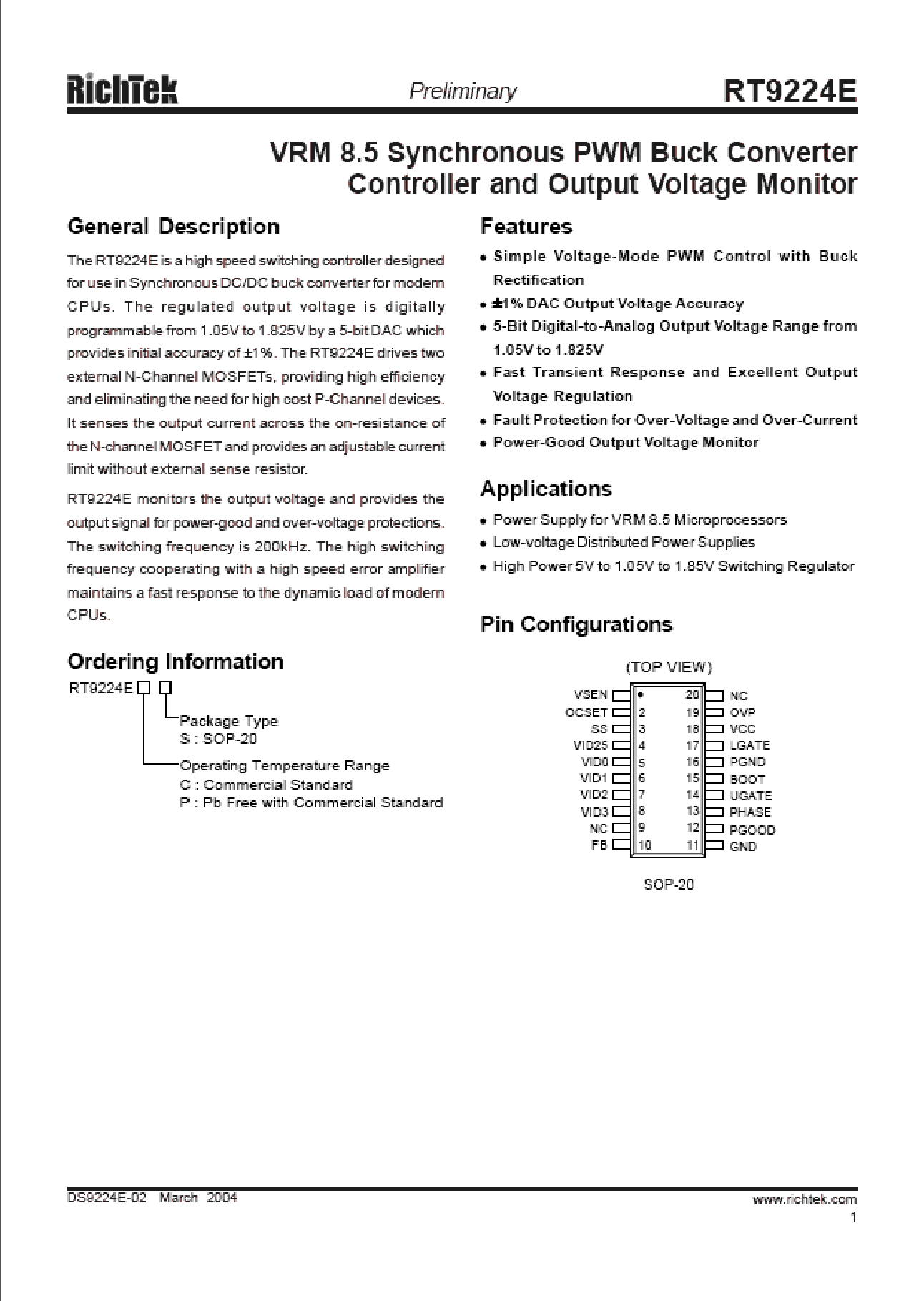 VRM 8.5 Synchronous PWM Buck Converter Controller and Output Voltage Monitor