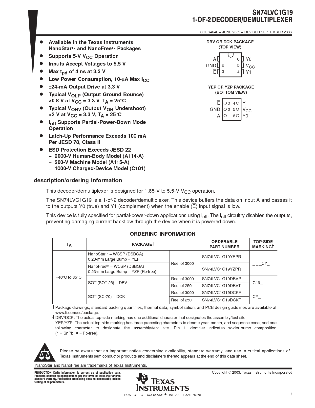 这 sn74lvc1g19 是 一个 1-的-2 解码器/多路分解器. 这个 设备 缓冲区 这 数据 开启 输入 一个 和 通行证 它