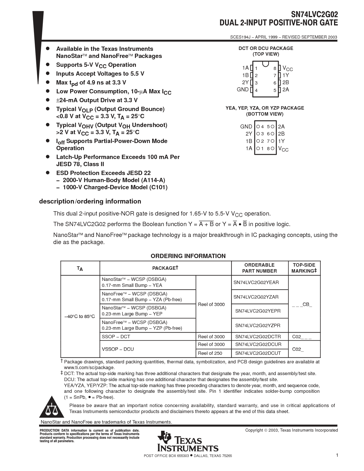 浏览型号SN74LVC2G02YEPR的Datasheet PDF文件第2页