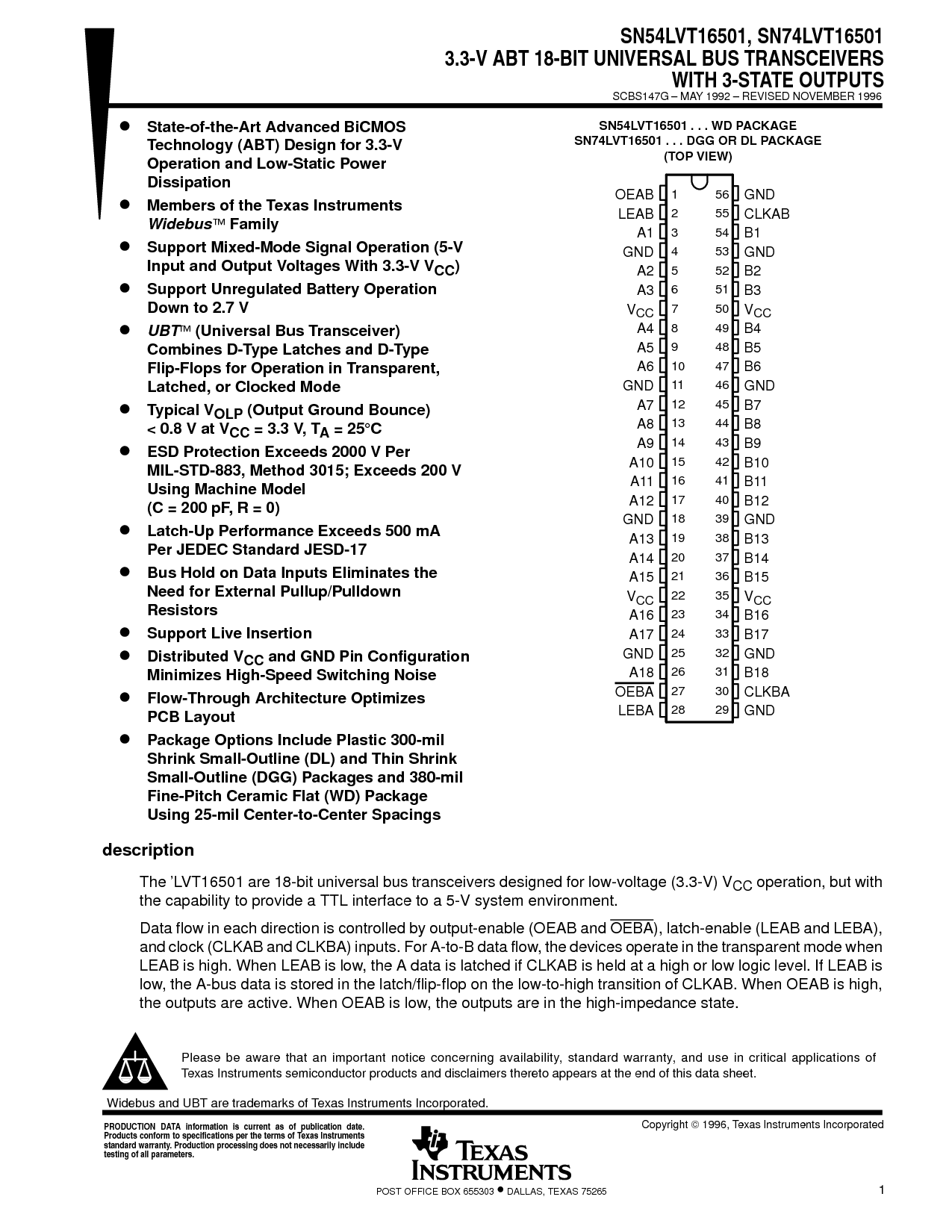 这 ’lvt16501 是 18-有点 通用 总线 收发器 设计 用于 低电压 (3.3-v) v