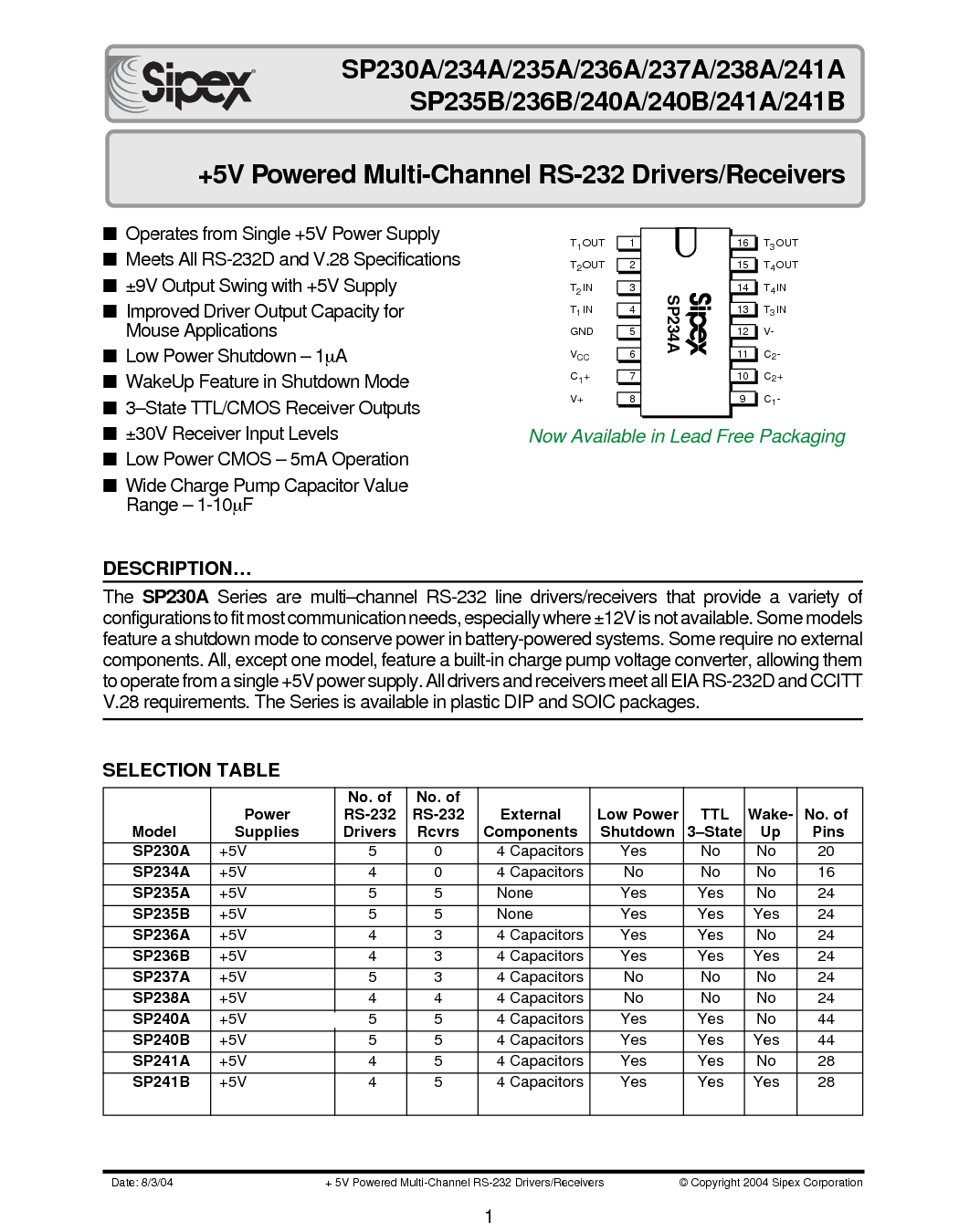 日期: 8/3/04+ 5v 通电 多通道 rs-232 驱动程序/接收器© 版权 2004 sipex 公司