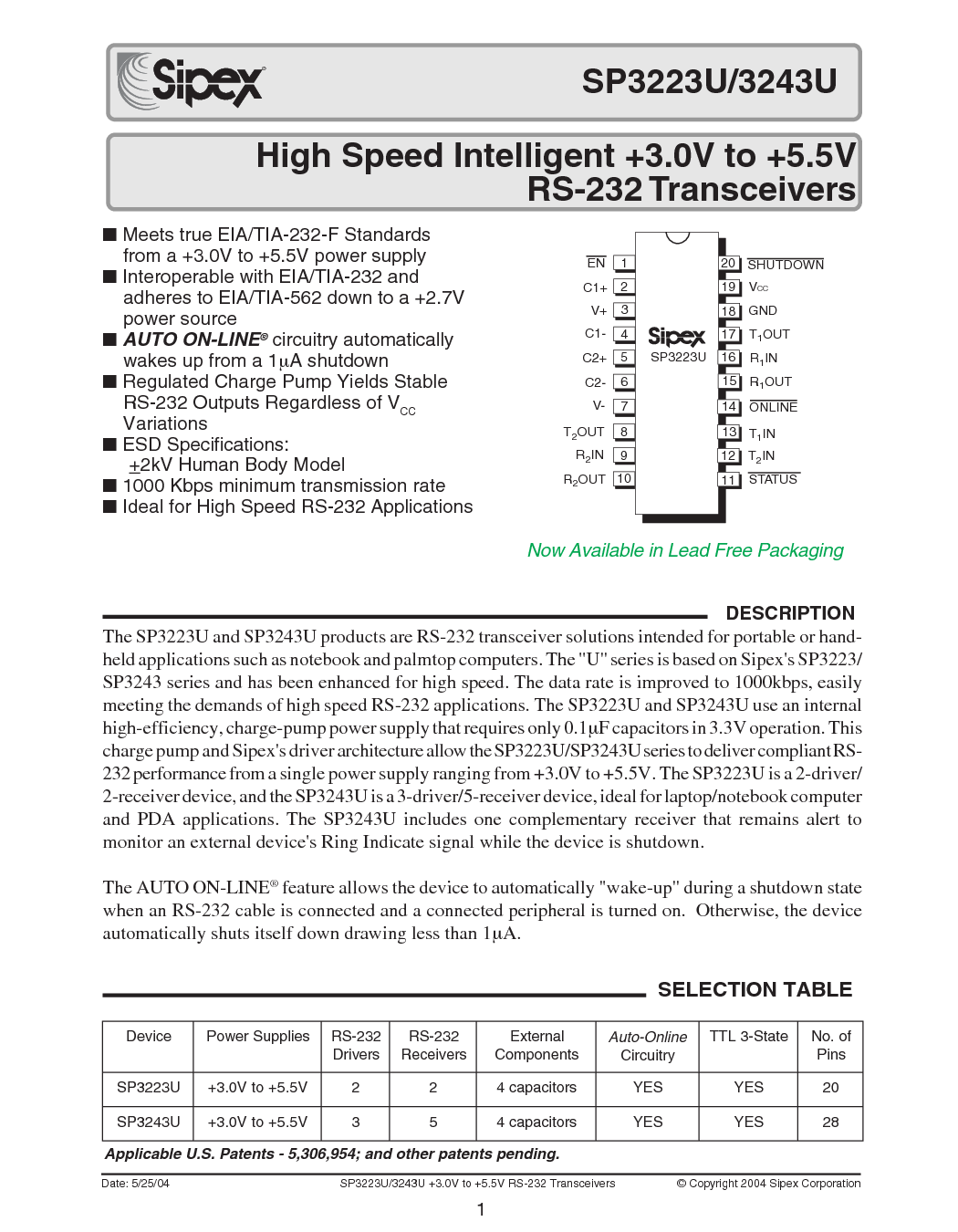 日期: 5/25/04 sp3223u/3243u +3.0v 至 +5.5v rs-232 收发器 © 版权 2004 sipex 公司