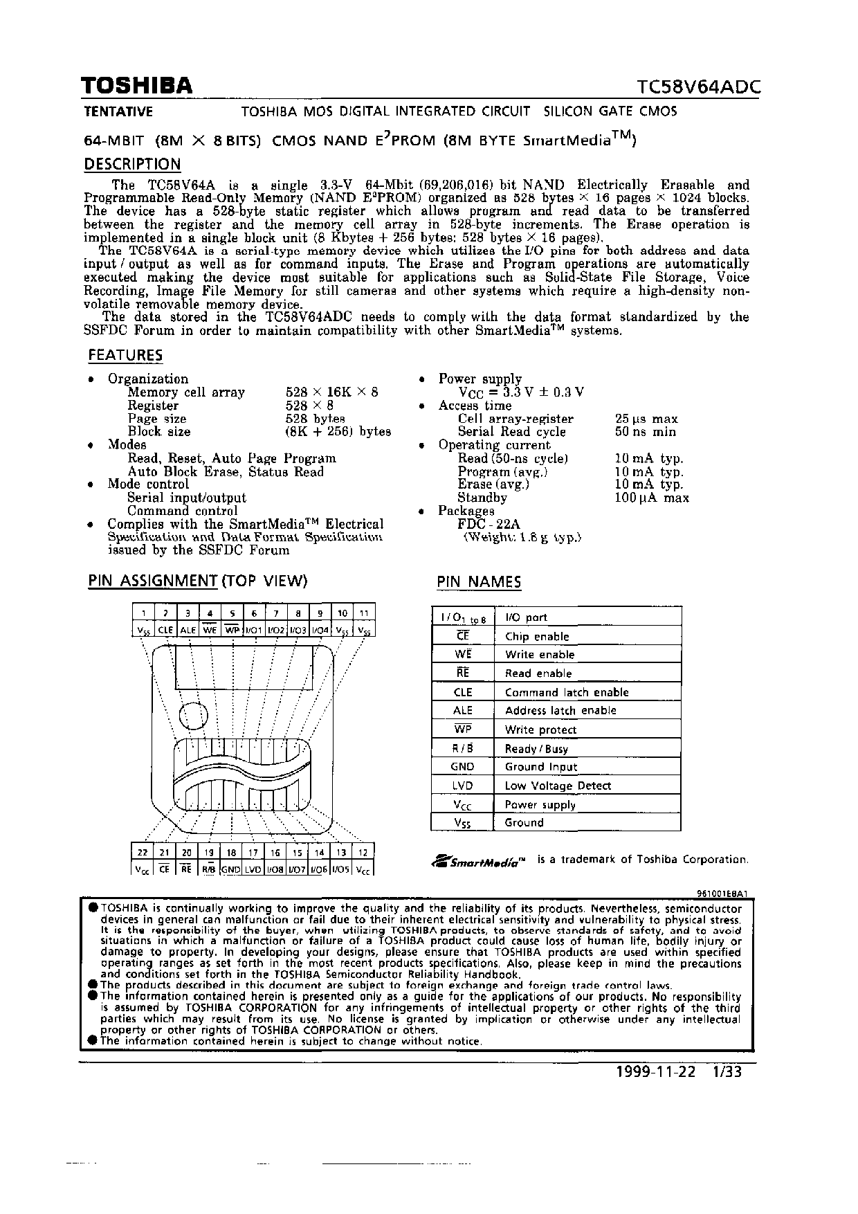 64-MBIT (8M X 8BITS) CMOS NAND E PROM (8M BYTE SmartMedia)