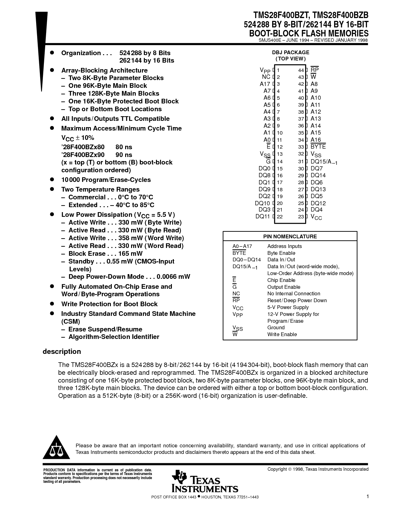 是 电气 块-已擦除 和 重新编程. 这 tms28f400bzx 是 有组织的 入点 一个 已阻塞 体系结构