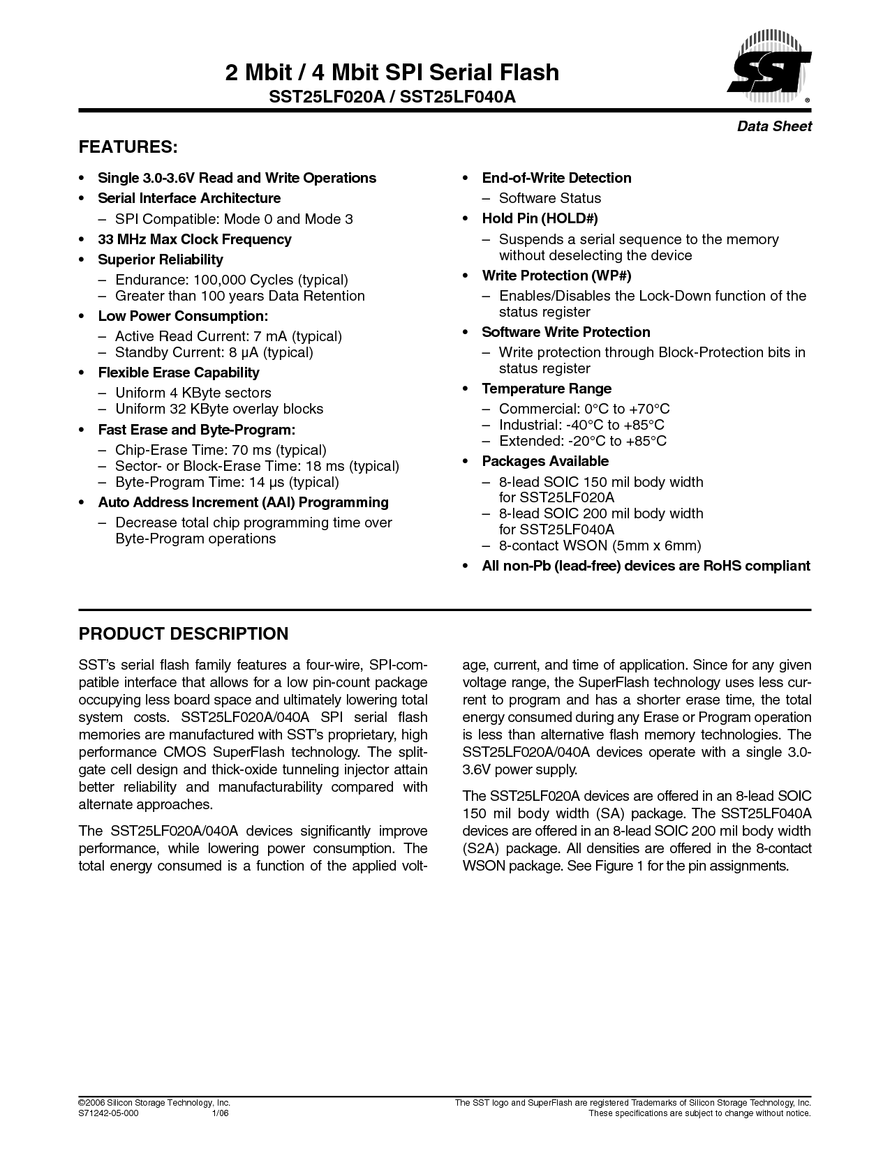 sst25lf020a/040a 设备 操作 与 一个 单独 3.0-