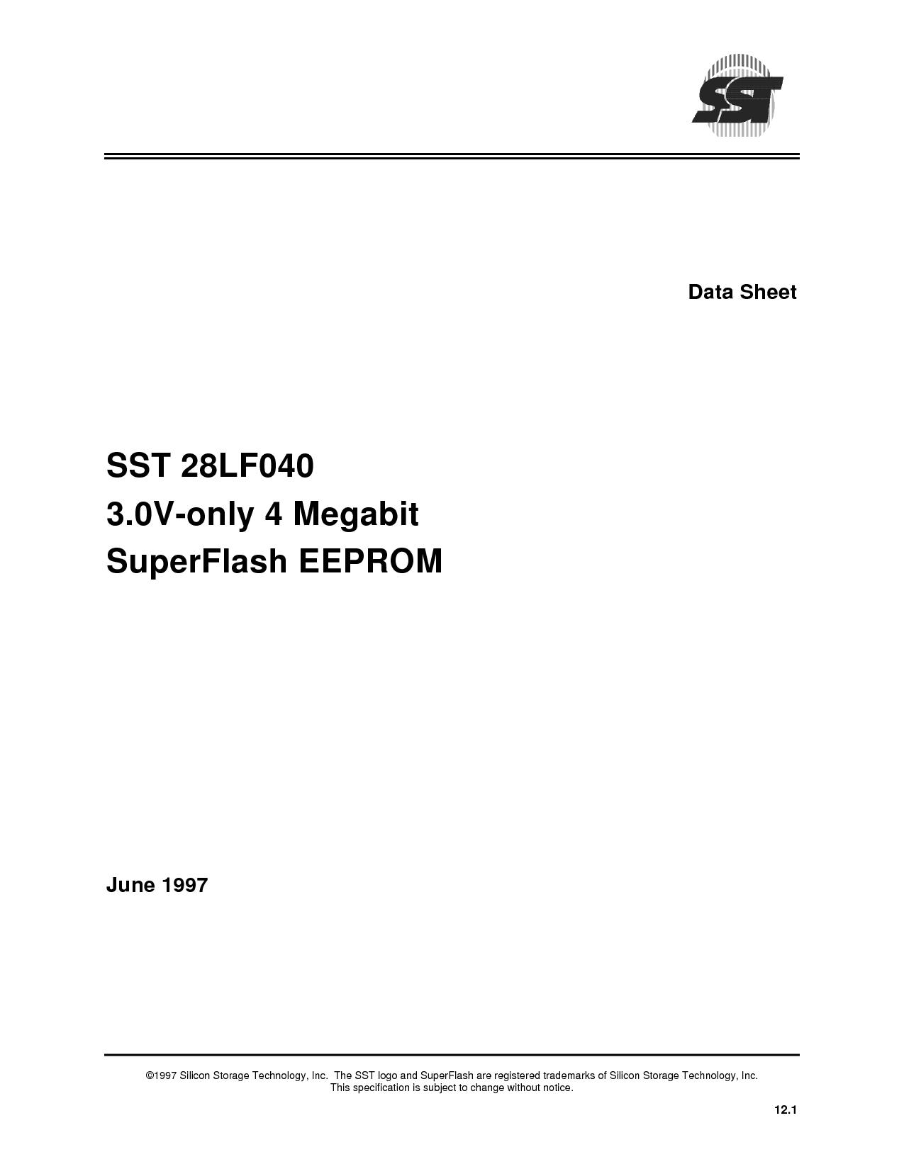 ©1997 硅 存储 技术, 公司 这 sst 徽标 和 superflash 是 已注册 商标 的 硅 存储 技术, 公司 这个 规格 是 主题 至 变更 无 通知. 12.1 数据 工作表 sst 28lf040 3.0v-仅 4 兆位 superflash 可擦可编程只读存储器 六月 1997 | |
