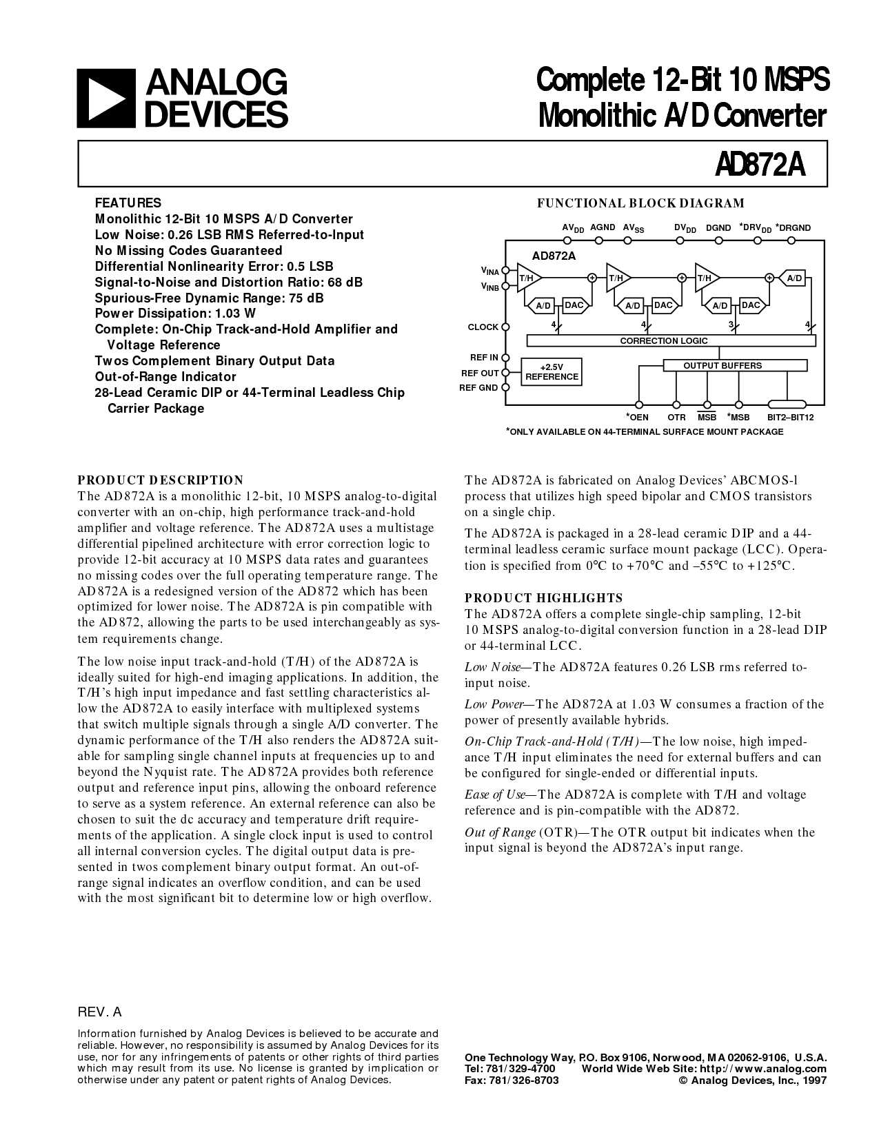 这 ad872a 是 一个 单片 12-有点, 10 msps 模数转换
