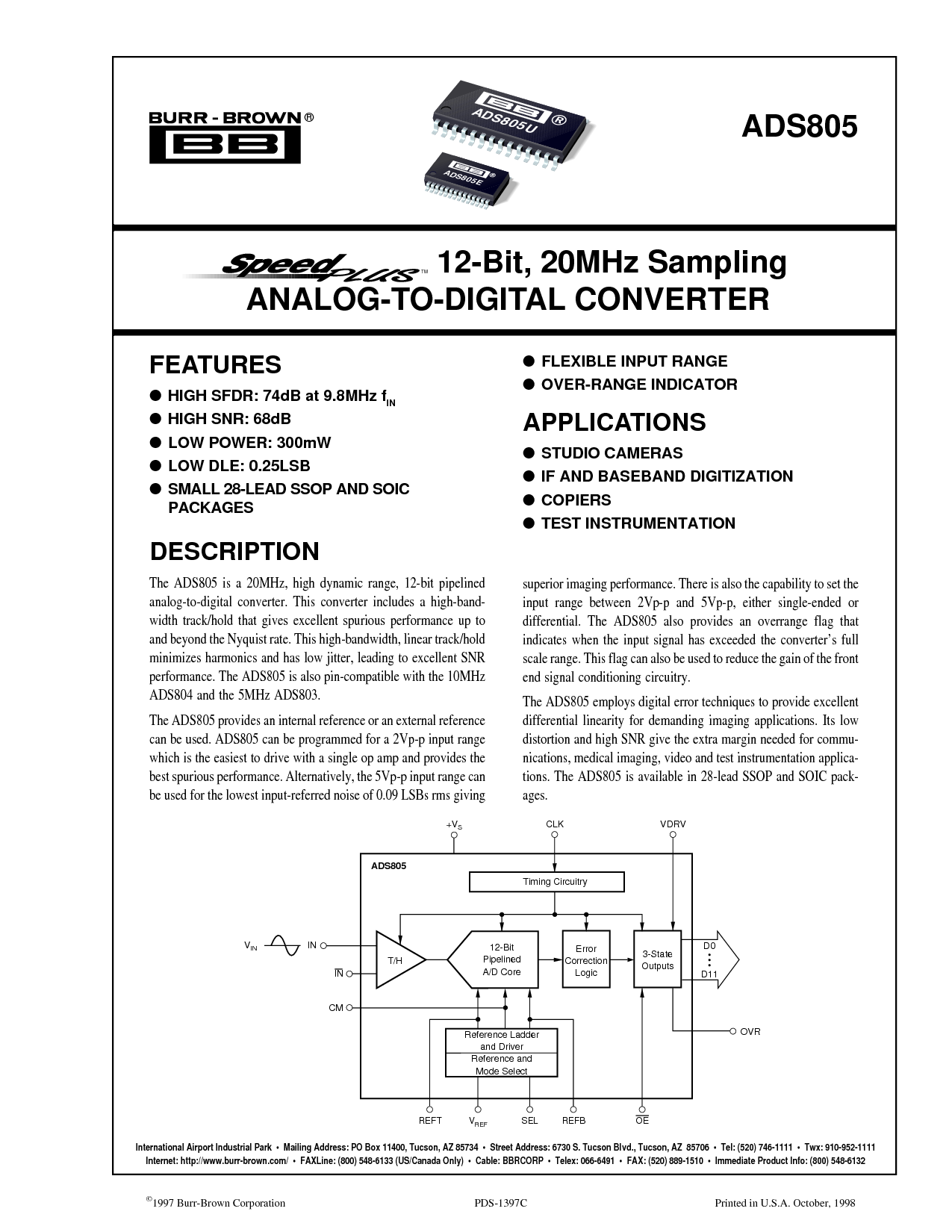 这 ads805 是 一个 20mhz, 高 动态 范围, 12-有点 流水线