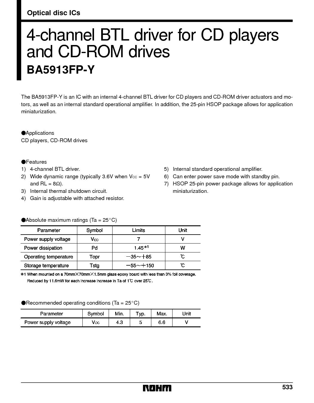 这 ba5913fp-y 是 一个 集成电路 与 一个 内部 4-频道 btl 驾驶员 用于 光盘 玩家 和 光盘-rom 驾驶员 执行机构 和 mo-
