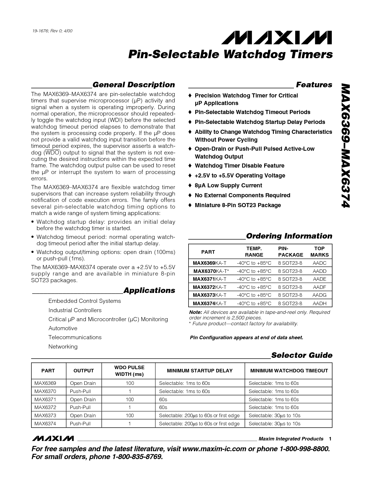 用于 免费 样品 和 这 最新 文学, 参观 www.马克西姆-集成电路.com 或 电话 1-800-998-8800.