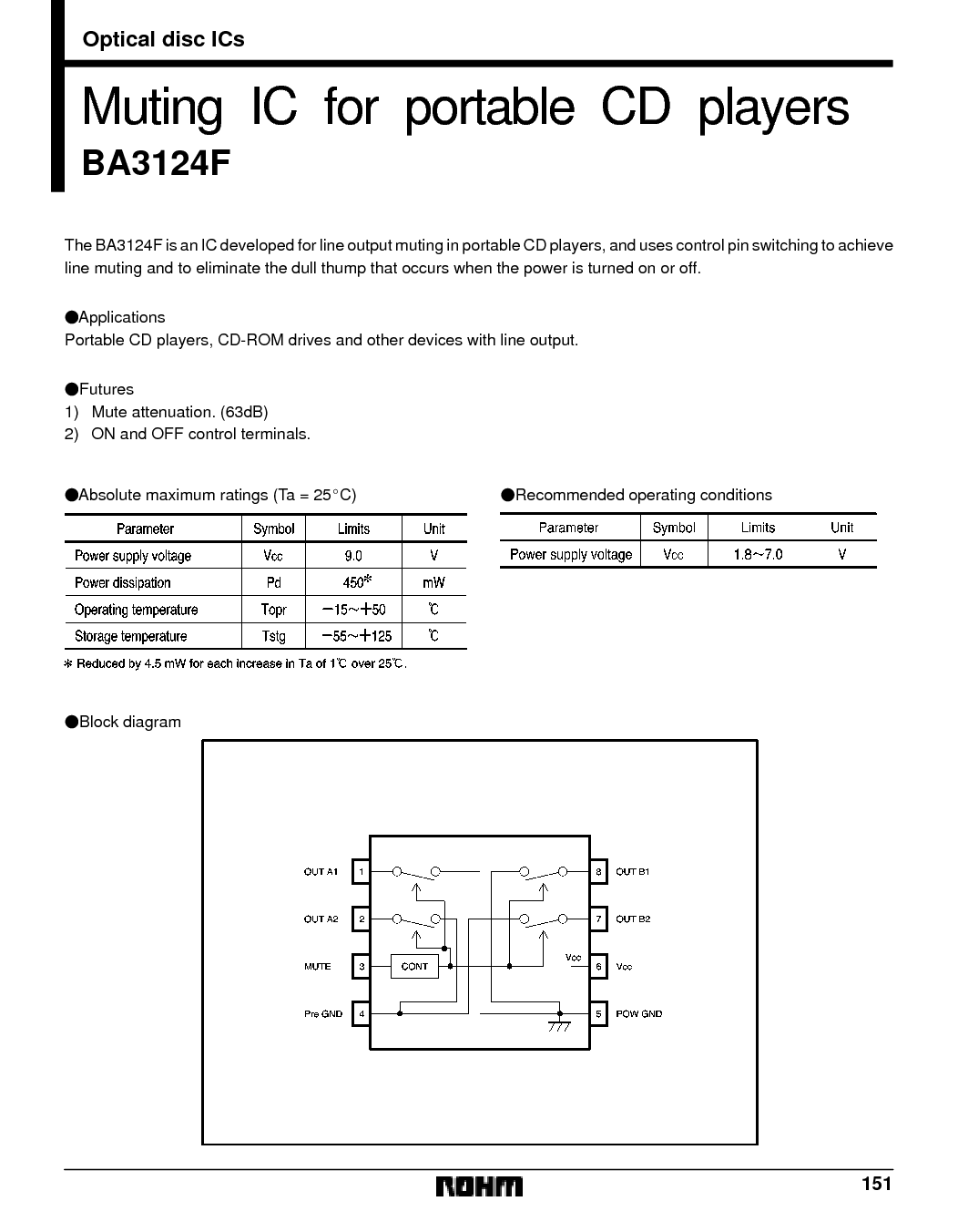 这 ba3124f 是 一个 集成电路 已开发 用于 线 输出 静音 入点 便携式 光盘 玩家, 和 用途 控制 管脚 开关 至 实现