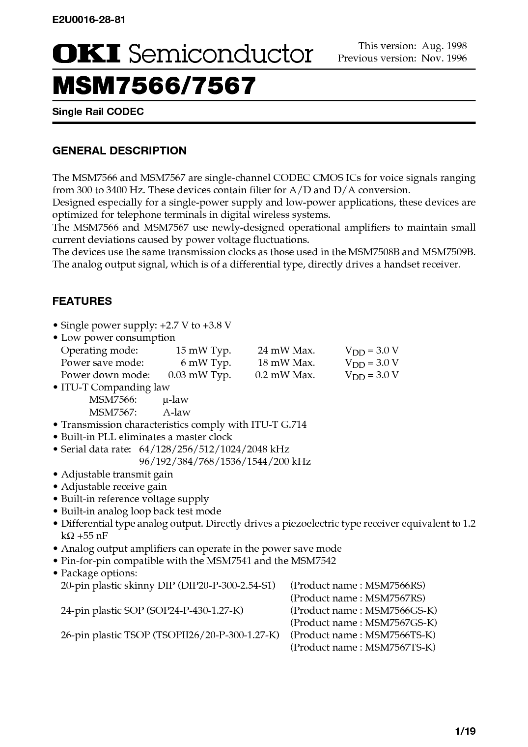 这 msm7566 和 msm7567 是 单通道 编解码器 cmos ics 用于 语音 信号 测距