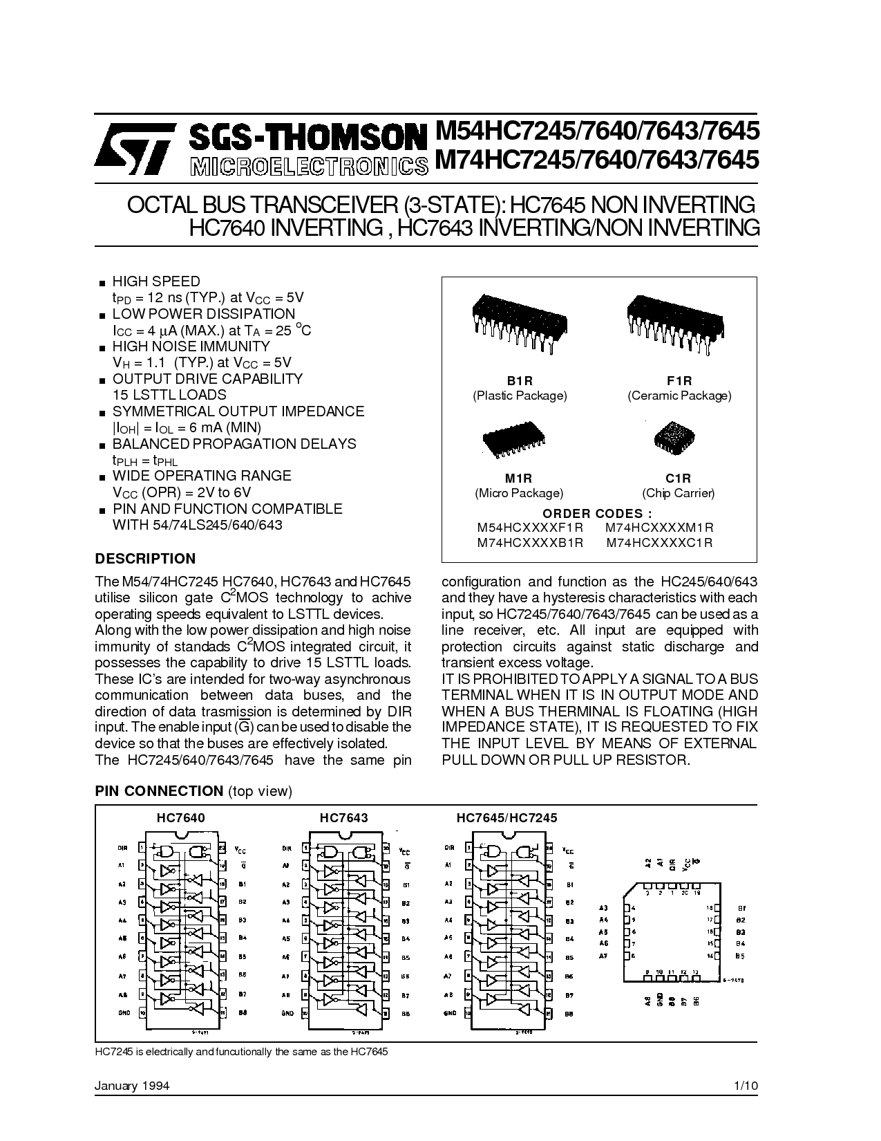OCTAL BUS TRANSCEIVER (3-STATE): HC7645 NON INVERTING HC7640 INVERTING , HC7643 INVERTING/NON INVERTING