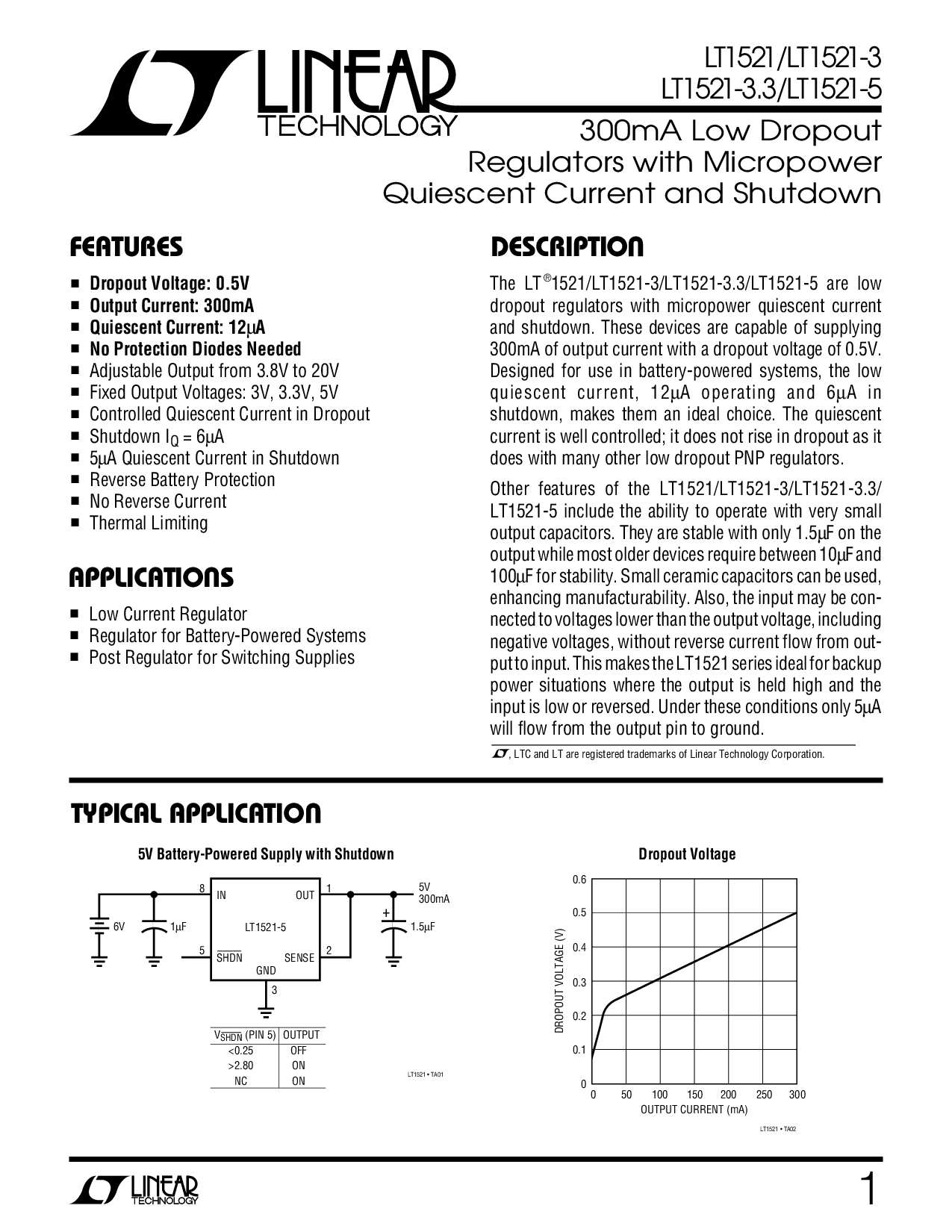 300mA Low Dropout Regulators with Micropower Quiescent Current and Shutdown