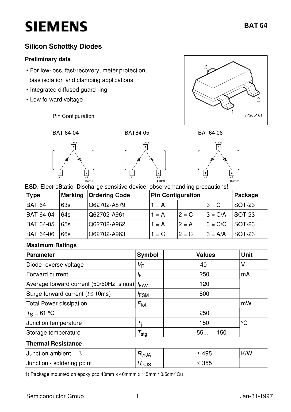 蝙蝠 64-04 64s q62702-a961 1 = 一个 2 = c 3 = c/一个 sot-23