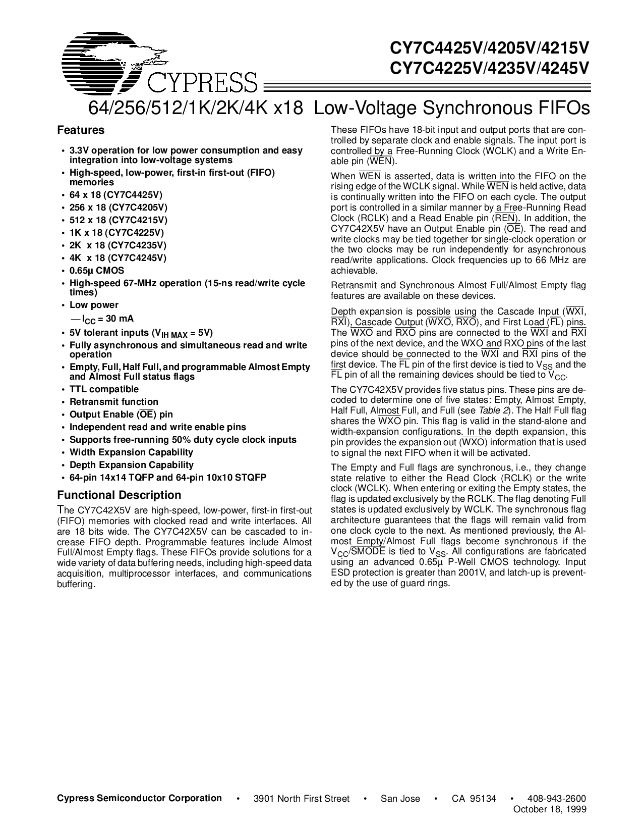 是 18 比特 宽. 这 cy7c42x5v 可以 是 级联 至 入点-