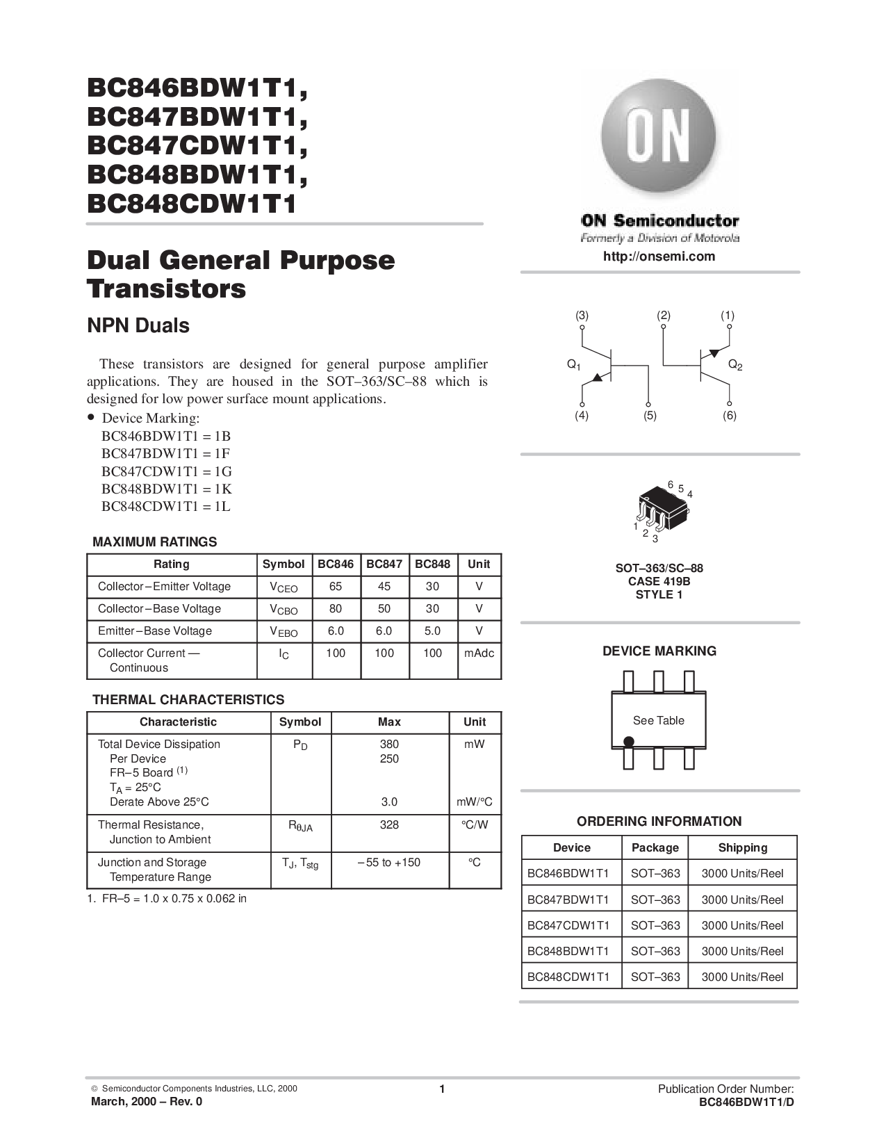 BC848CDW1T1 SOT–363 3000 单位/卷轴