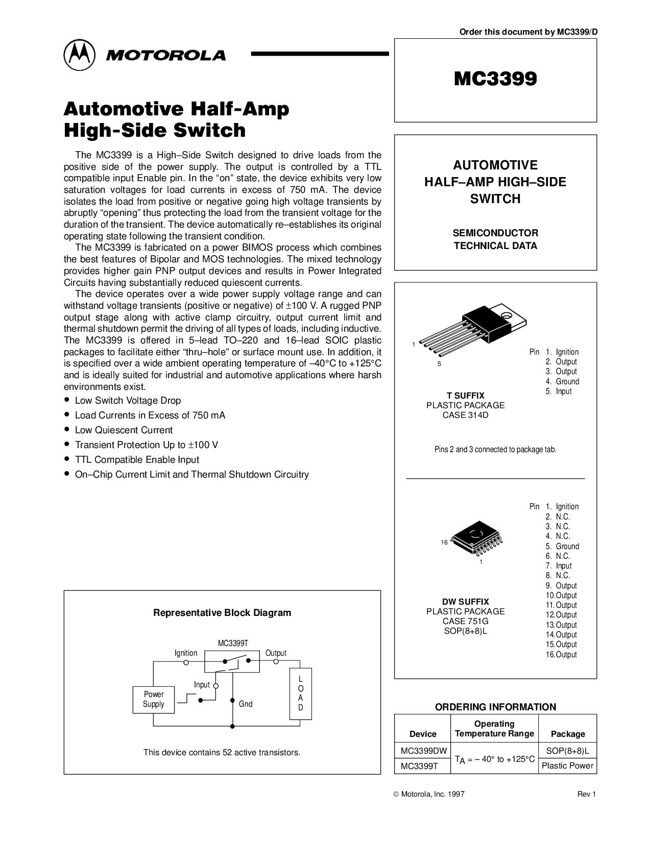 这 mc3399 是 一个 high–side 开关 设计 至 驱动器 荷载 从 这