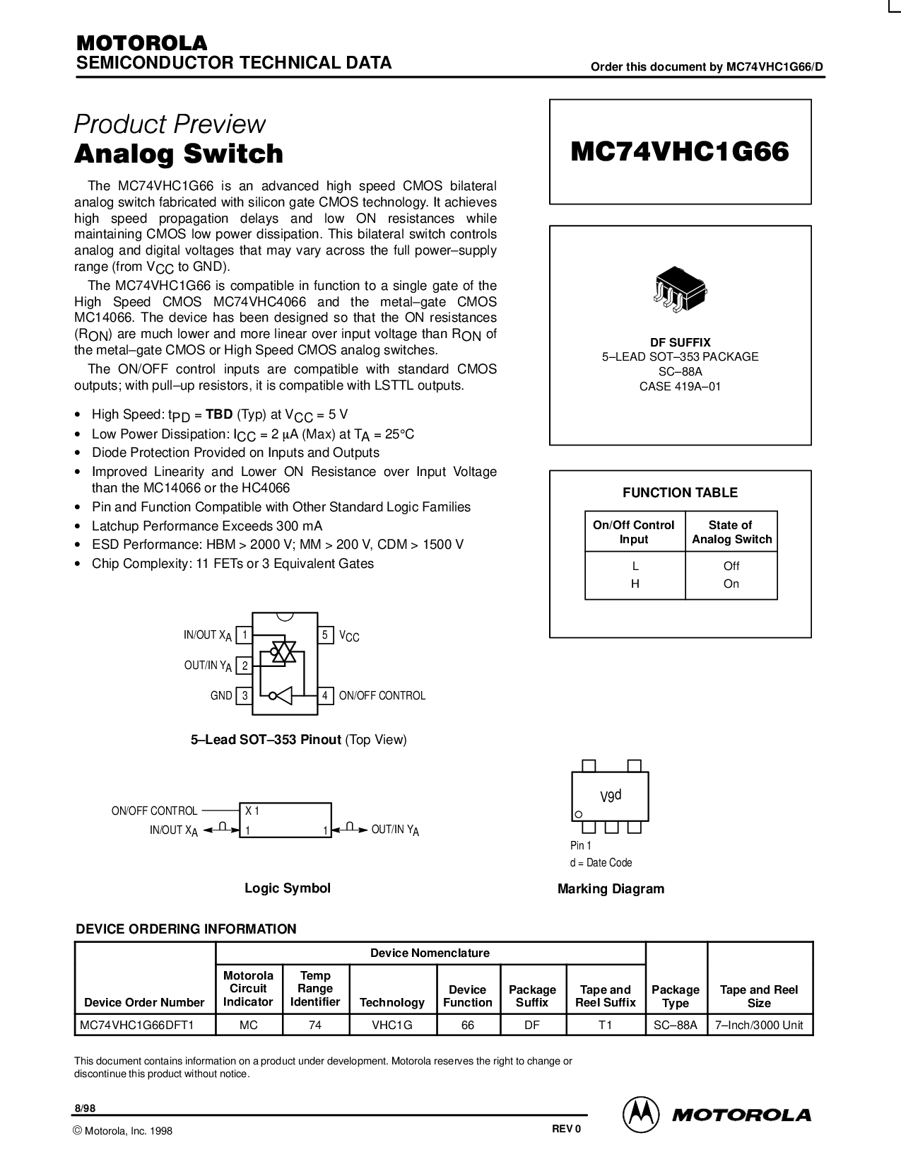 MC74VHC1G66DFT1 mc 74 VHC1G 66 df T1 SC–88A 7–inch/3000 单位