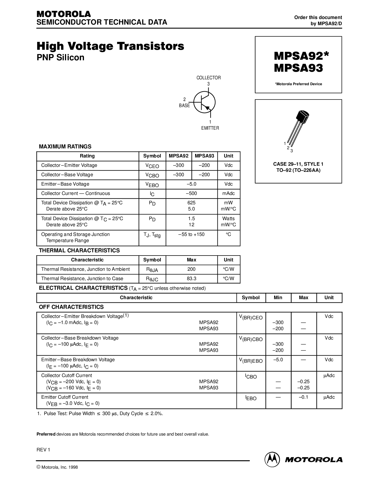 评级 符号 MPSA92 MPSA93 单位