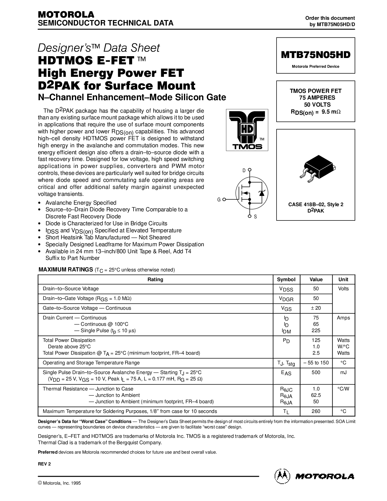 浏览型号MTB75N05HD/D的Datasheet PDF文件第2页