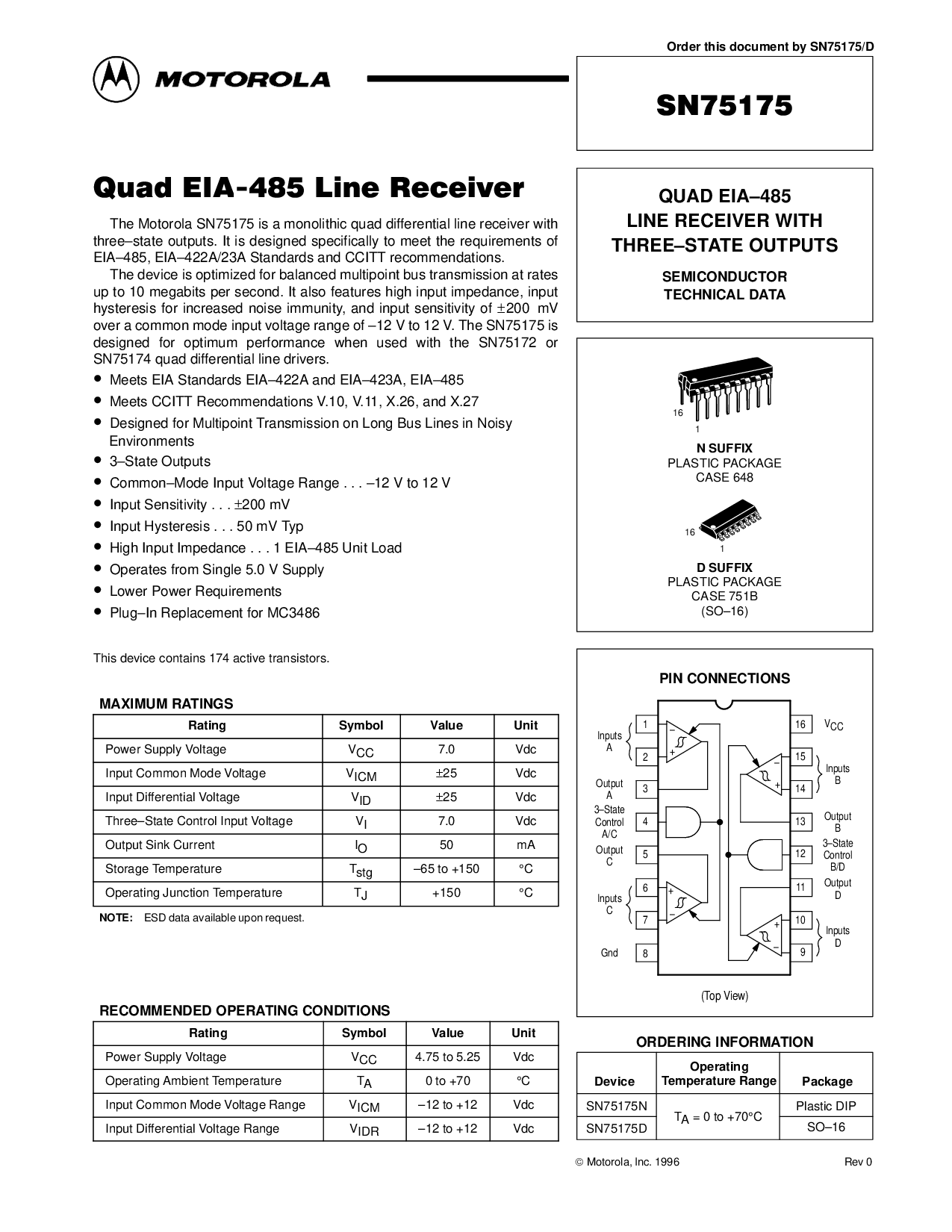 这 摩托罗拉 sn75175 是 一个 单片 四边形 差速器 线 接收器 与
