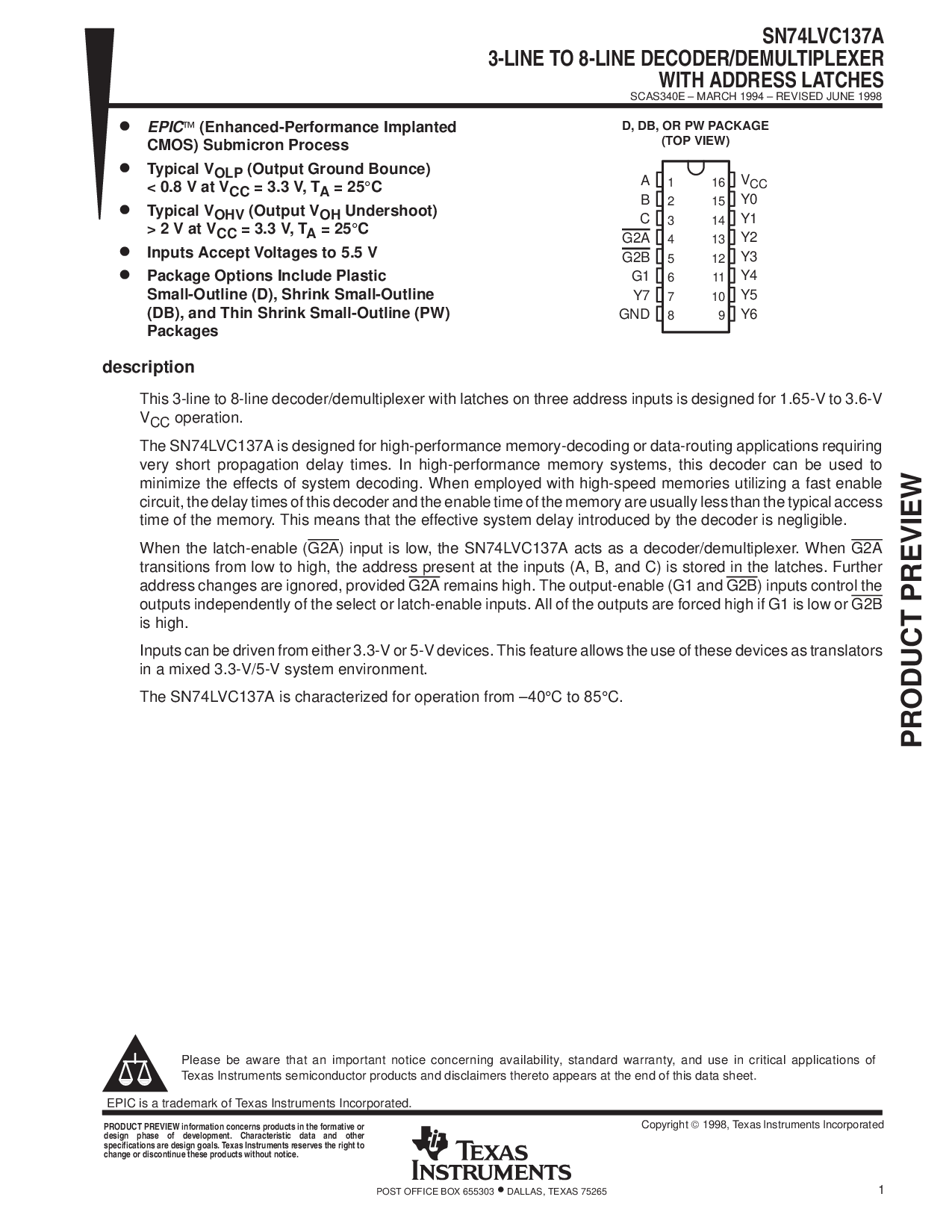 这 sn74lvc137a 是 设计 用于 高性能 记忆-解码 或 数据-路由 应用程序 要求