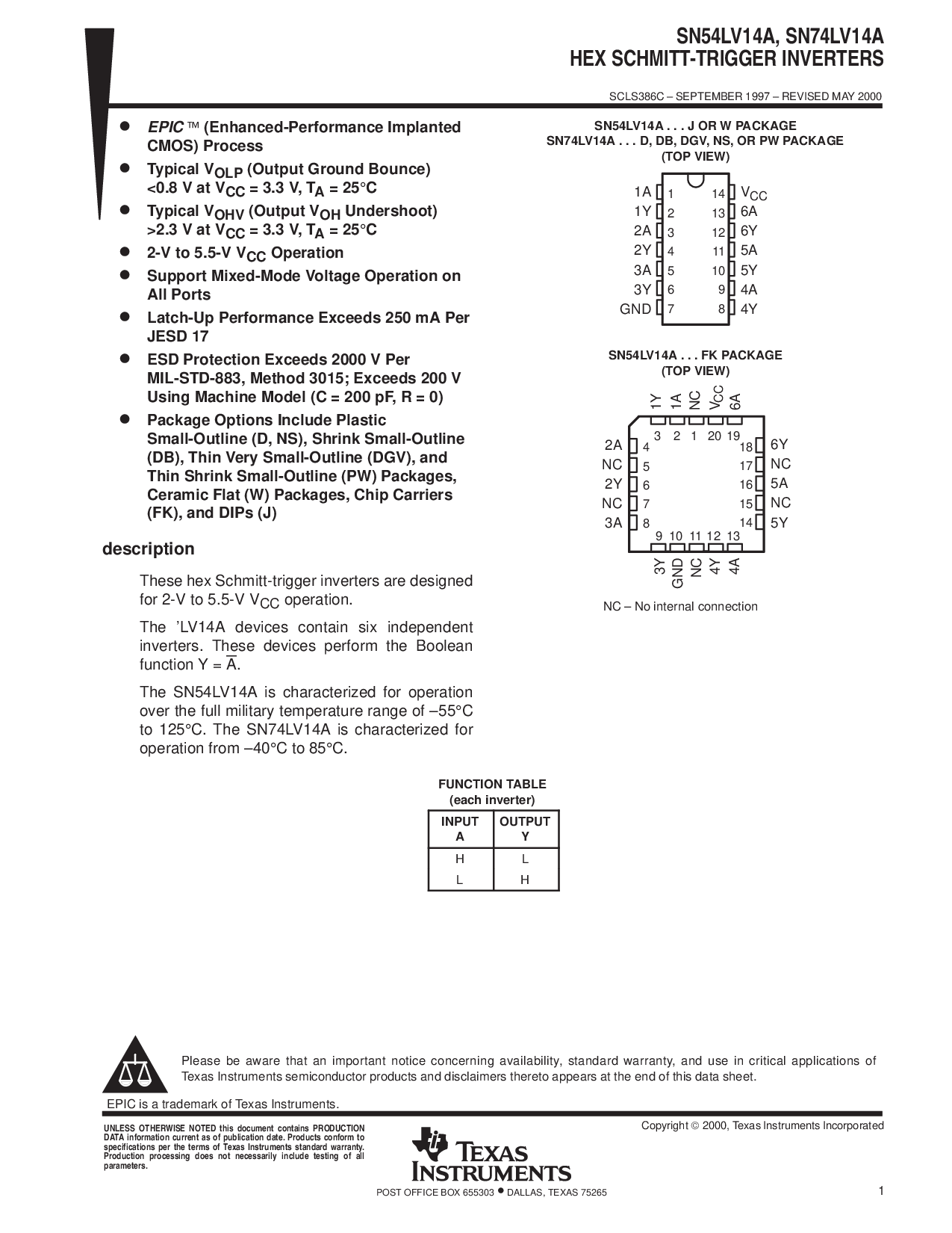 SN74LV14A . . . d, db, dgv, ns, 或 pw 包装