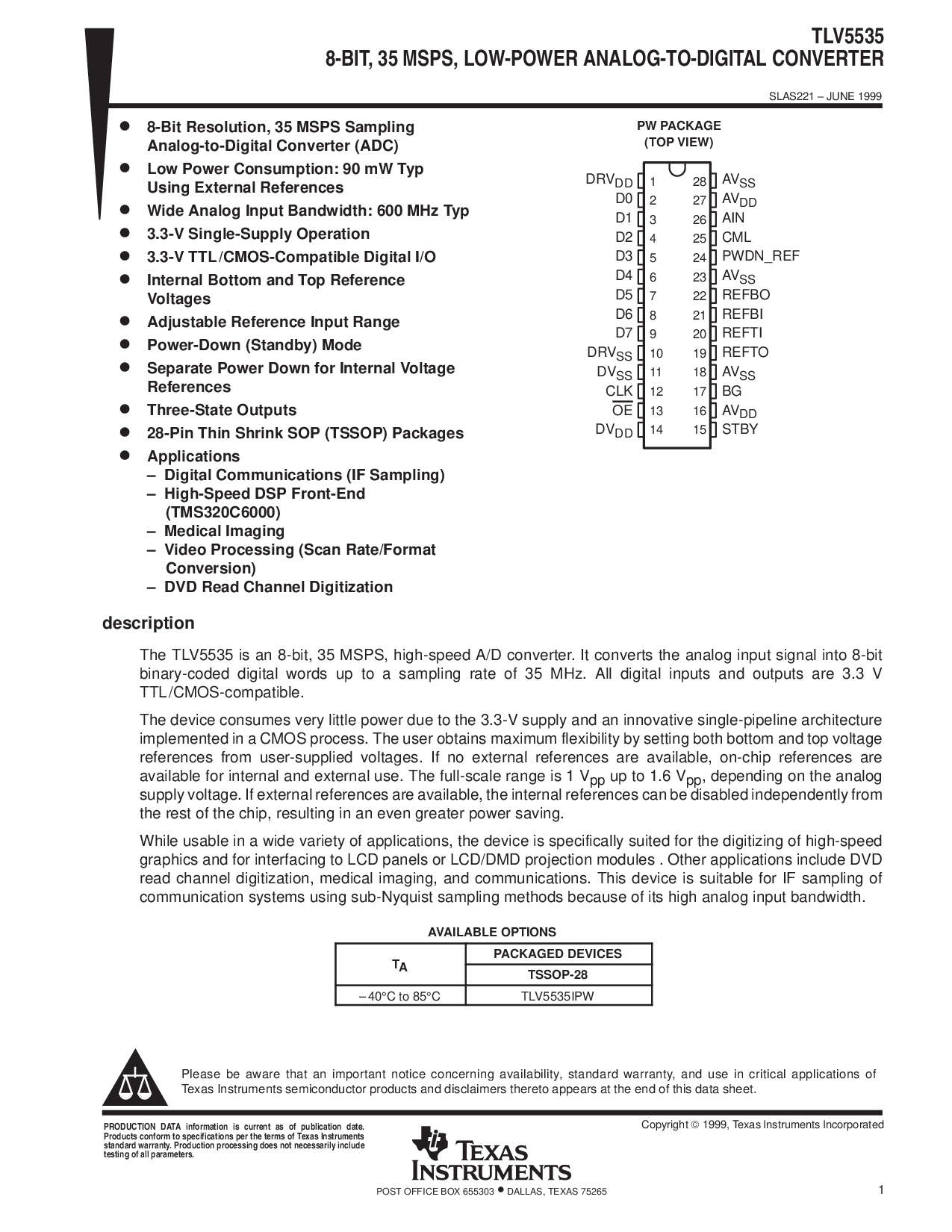 这 tlv5535 是 一个 8-有点, 35 msps, 高速 一个/d 变频器. 它 转换 这 模拟 输入 信号 进入 8-bit