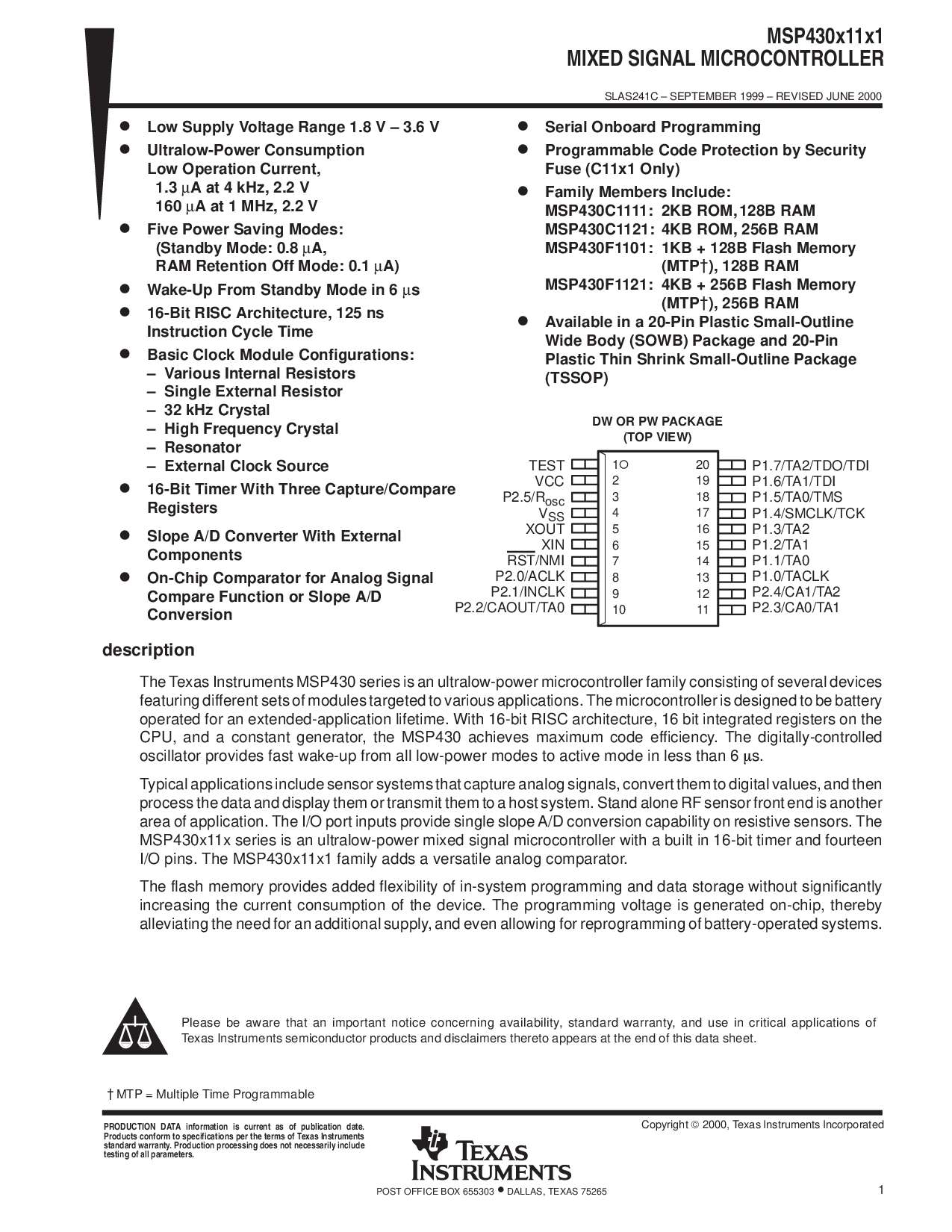 msp430x11x 系列 是 一个 超低功耗 混合 信号 微控制器 与 一个 已建成 入点 16-有点 计时器 和 十四