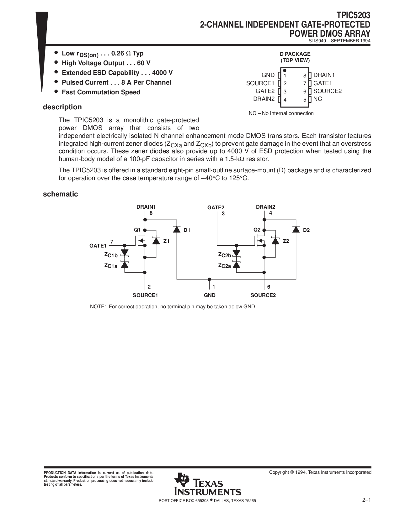 这 tpic5203 是 提供 入点 一个 标准 八-管脚 小轮廓 表面贴装 (d) 包装 和 是 表征