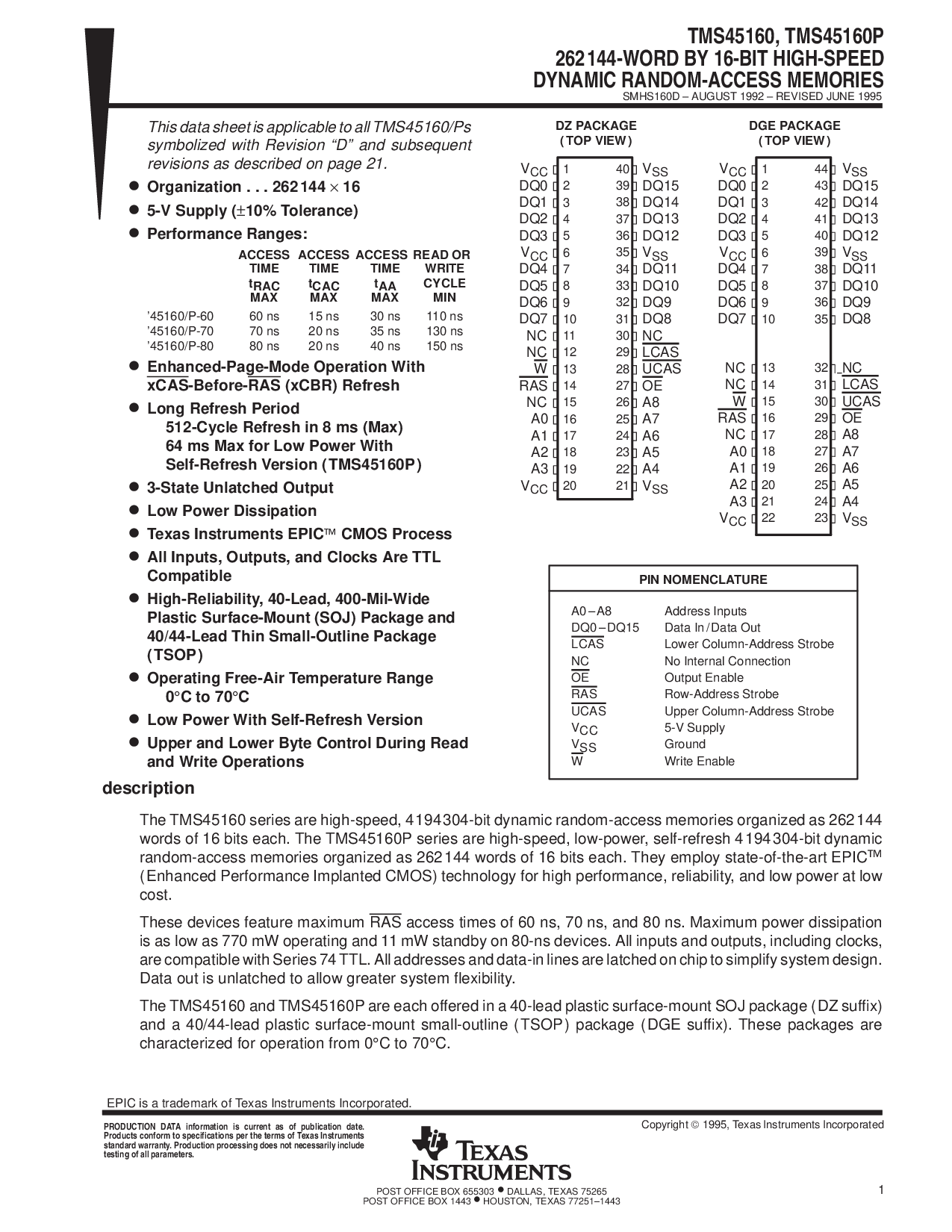 字词 的 16 比特 每个. 这 tms45160p 系列 是 高-速度, 低-电源, 自刷新 4194304-有点 动态