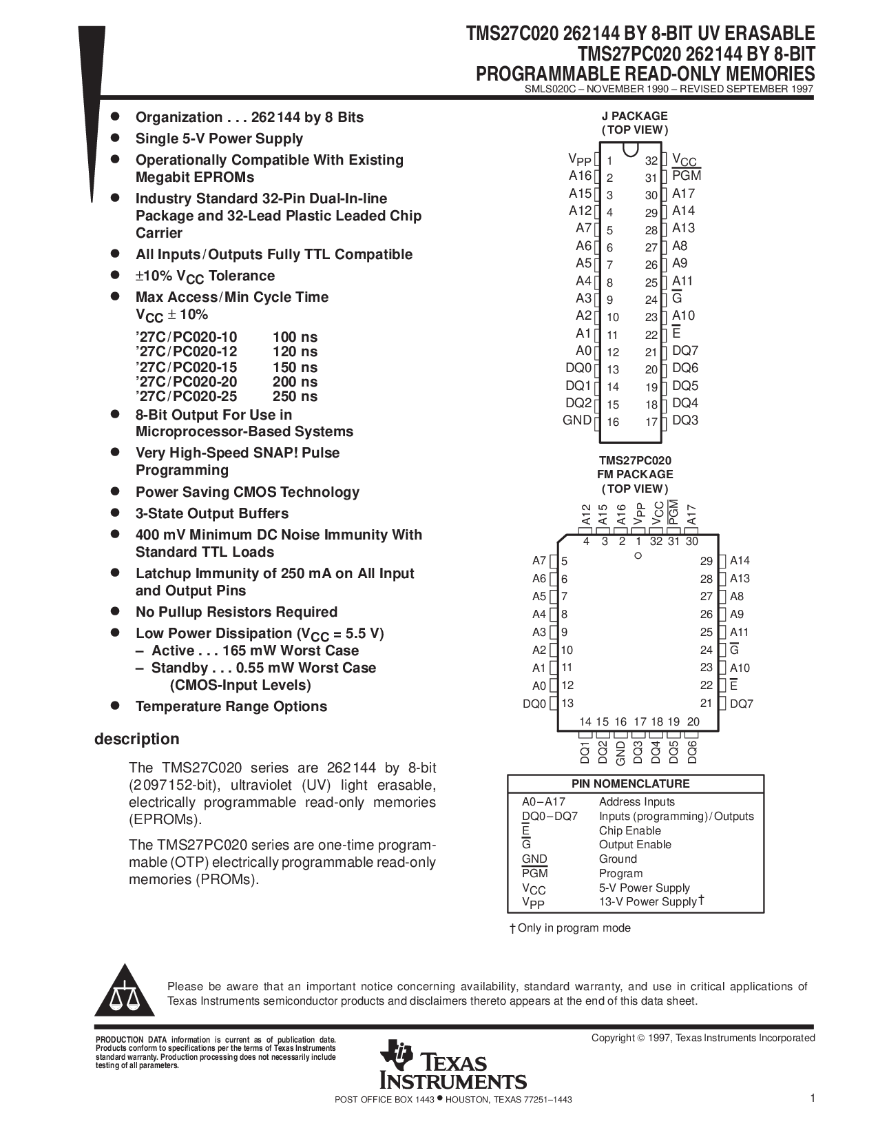 TMS27PC020 262144 BY 8-BIT PROGRAMMABLE READ-ONLY MEMORIES