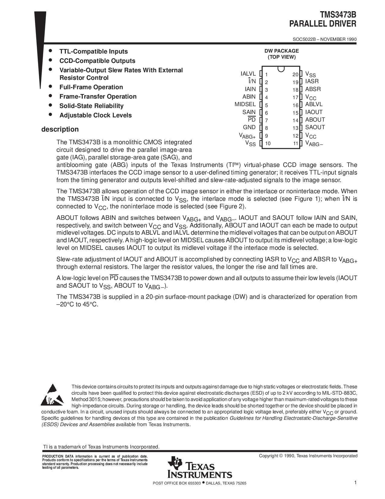 这 tms3473b 是 提供的 入点 一个 20-管脚 表面贴装 包装 (dw) 和 是 表征 用于 操作 从