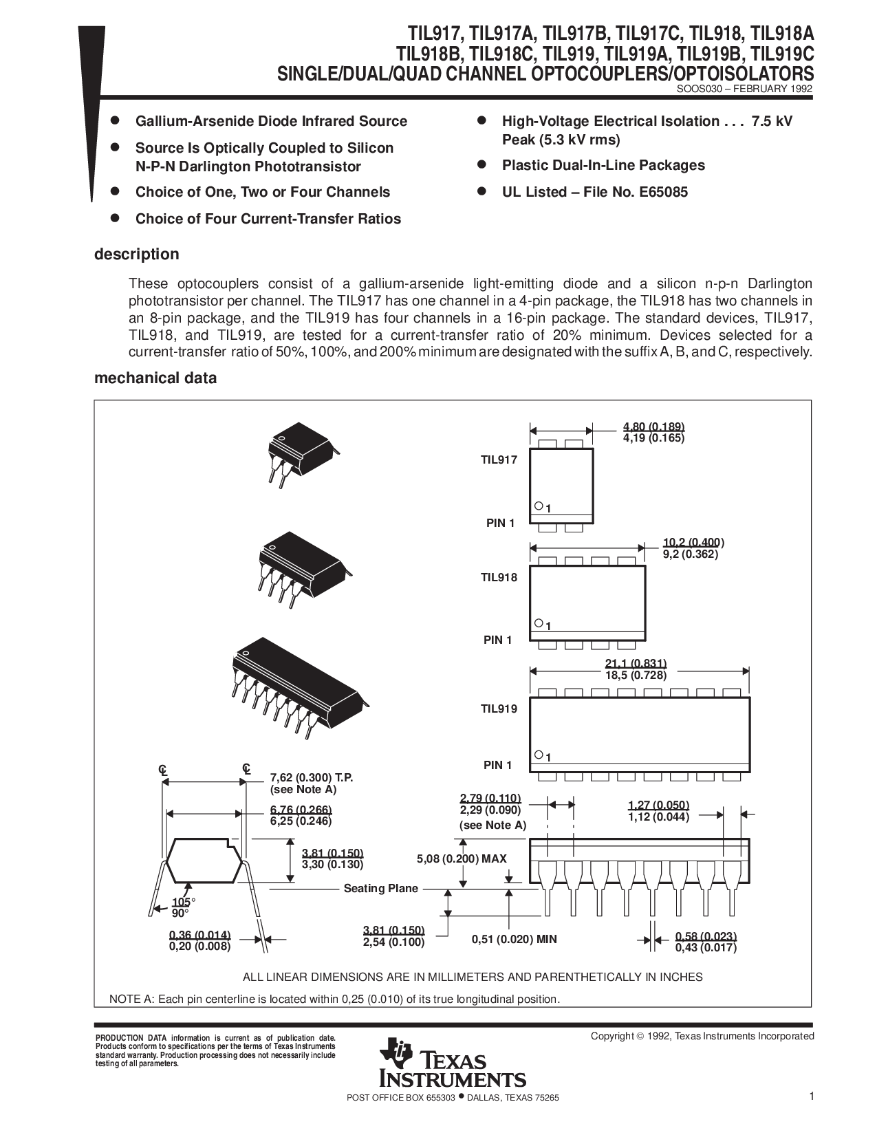 光电晶体管 按 频道. 这 til917 有 一个 频道 入点 一个 4-管脚 包装, 这 til918 有 两个 频道 入点